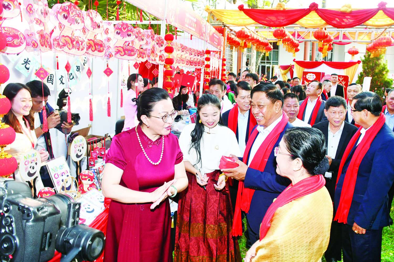 ဦးစွာ ဒုတိယဝန်ကြီးချုပ်နှင့် နိုင်ငံတော်ဝန်ကြီးချုပ်ရုံး ပြည်ထောင်စုဝန်ကြီး ဗိုလ်ချုပ်ကြီး တင်အောင်စန်းနှင့် ဇနီးနှင့် တာဝန်ရှိသူများ၊ မြန်မာနိုင်ငံဆိုင်ရာ တရုတ်နိုင်ငံသံအမတ်ကြီးနှင့် တာဝန်ရှိသူများသည် တရုတ်ရိုးရာပစ္စည်းများ ပြသထားသည့်ဆိုင်ခန်းများအား လှည့်လည်ကြည့်ရှုအားပေးသည်။
