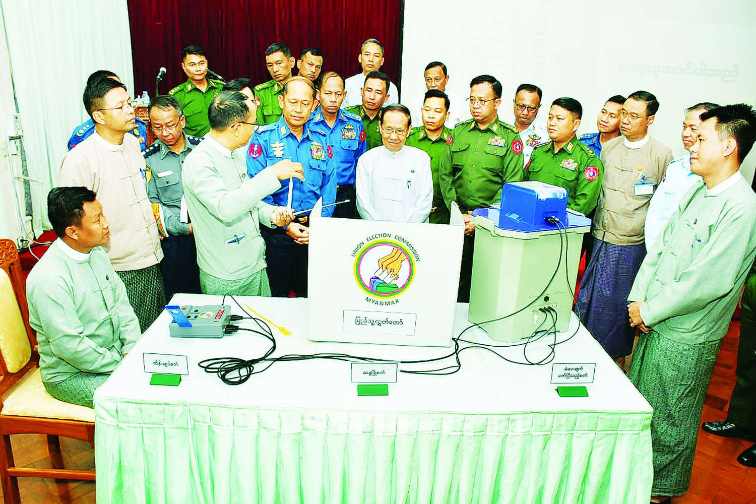 ပြည်ထောင်စုရွေးကောက်ပွဲကော်မရှင်ဥက္ကဋ္ဌ မြန်မာအီလက်ထရောနစ်မဲပေးစက်နှင့်စပ်လျဉ်းပြီး ရှင်းလင်းပြသခြင်းနှင့် လက်တွေ့သရုပ်ပြ စမ်းသပ်မဲပေးခြင်း သွားရောက်ကြည့်ရှု
