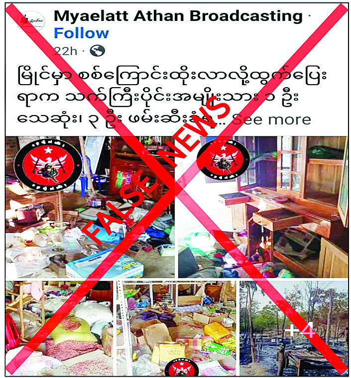 အဆိုပါသတင်းနှင့်ပတ်သက်၍ သက်ဆိုင်ရာတာဝန်ရှိသူတစ်ဦး၏ ပြောကြားချက်အရ အဆိုပါကျေးရွာအနီး အကြမ်းဖက်သောင်းကျန်းသူများ ခိုအောင်းနေထိုင်နေကြောင်း အကြမ်းဖက်မှုကို မလိုလားသည့် ဒေသခံပြည်သူများ၏ သတင်းပေးပို့ချက်အရ လုံခြုံရေးတပ်ဖွဲ့ဝင်များက လိုအပ်သည့် လုံခြုံရေးလုပ်ငန်းများ သွားရောက်လုပ်ကိုင်ရာ အကြမ်းဖက်သမားများသည် ခေတ္တထွက်ပြေးတိမ်းရှောင်သွားကြောင်း၊ လုံခြုံရေးတပ်ဖွဲ့ဝင်များသည် လုံခြုံရေးလုပ်ငန်းများ လုပ်ဆောင်ပြီး ပြန်လည်ထွက်ခွာလာစဉ် အကြမ်းဖက်သမားများက ၎င်းကျေးရွာအတွင်းသို့ ပြန်လည်ဝင်ရောက်လာကာ ဒေသခံပြည်သူများအား ခေါင်းစဉ်အမျိုးမျိုးတပ်၍ ဖမ်းဆီး၊ နှိပ်စက်၊ သတ်ဖြတ်ခြင်းများ လုပ်ဆောင်သွားကြောင်းနှင့် တရားမဝင် ပြည်ဖျက်မီဒီယာများက အကြမ်းဖက်သမားများ၏ လုပ်ရပ်များကို ဖုံးကွယ်ရန်နှင့် နယ်မြေလုံခြုံရေးဆောင်ရွက်လျက်ရှိသည့် လုံခြုံရေးတပ်ဖွဲ့ဝင်များအပေါ် ပြည်သူများ အထင်အမြင်လွဲမှားစေရန်၊ ရည်ရွယ်ချက်ရှိရှိ ယခုကဲ့သို့ လုပ်ကြံရေးသား ဖြန့်ဝေနေခြင်းဖြစ်ကြောင်း သိရှိရသည်။