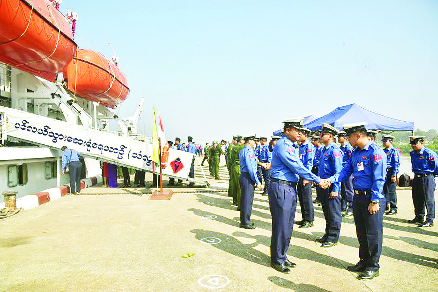 တပ်မတော်နယ်လှည့်အထူးကုဆေးအဖွဲ့မှ ပါရဂူများ၊ ဆေးမှူးများနှင့် သူနာပြုများပါဝင်သည့် တပ်မတော်ပင်လယ်သွားဆေးရုံရေယာဉ် (သံလွင်) သည် တနင်္သာရီကမ်းရိုးတန်းတစ်လျှောက်ရှိ မြို့နယ်၊ ကျေးရွာများ၊ ရန်ကုန်တိုင်းဒေသကြီး ကိုကိုးကျွန်းမြို့နယ်နှင့် ဧရာဝတီတိုင်းဒေသကြီး ဟိုင်းကြီးကျွန်းမြို့နယ်အတွင်းရှိ ပတ်ဝန်းကျင်ကျေးရွာများမှ ဒေသခံပြည်သူများအား ဇန်နဝါရီ ၁၆ ရက်မှ ဖေဖော်ဝါရီ ၅ ရက်အထိ ကျန်းမာရေးစောင့်ရှောက်မှုလုပ်ငန်းများဆောင်ရွက်ပေးပြီး ယနေ့နံနက်ပိုင်းတွင် ရန်ကုန်မြို့ အမှတ် (၂) ရေတပ် ဆိပ်ခံတံတား (သီလဝါ) သို့ ပြန်လည်ရောက်ရှိလာရာ သန်လျင်တပ်နယ်မှ ဗိုလ်မှူးချုပ် သိန်းထူး ဦးဆောင်သော တပ်မတော် (ရေ) မှ အရာရှိကြီးများ၊ အရာရှိ၊ စစ်သည်၊ မိသားစုများက ကြိုဆိုနှုတ်ဆက်ကြသည်။