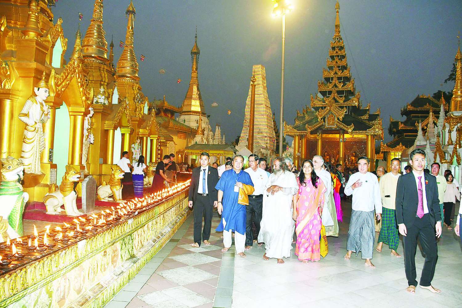 ညပိုင်းတွင် ဂုရုကြီးနှင့်အဖွဲ့သည် ရွှေတိဂုံစေတီတော်မြတ်ကြီးသို့ရောက်ရှိရာ ရန်ကုန်တိုင်းဒေသကြီးဝန်ကြီးချုပ် ဦးစိုးသိန်းနှင့် တိုင်းဒေသကြီးဝန်ကြီးများ၊ ဘုရားဂေါပကအဖွဲ့မှ တာဝန်ရှိသူများကကြိုဆိုနှုတ်ဆက်ကြသည်။
