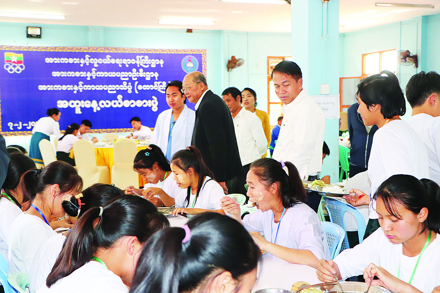 ထိုသို့ စစ်ဆေးစဉ် သင်တန်းသားသင်တန်းသူများ စားသောက်ရန်ချက်ပြုတ်ပြင်ဆင်မှု၊ စတိုခန်းအတွင်းပစ္စည်းများ သိုလှောင်ထိန်းသိမ်းမှု၊ နေ့စဉ် Menu ဇယားရေးဆွဲ၍ ချက်ပြုတ်ကျွေးမွေးမှုအခြေအနေများကို ကြည့်ရှုစစ်ဆေးပြီး သတ်မှတ်ထားသောနှုန်းထားအတိုင်း ပြည့်ဝစွာချက်ပြုတ်ကျွေးမွေးရန်၊ ကျန်းမာရေးနှင့်ညီညွတ်စွာ ချက်ပြုတ်ကျွေးမွေးခြင်း ရှိ/မရှိအား တာဝန်ခံဆရာဝန်နှင့် တာဝန်ရှိသူများက နေ့စဉ်အလှည့်ကျစစ်ဆေး၍ နေ့စဉ်စစ်ဆေးချက်မှတ်တမ်းထားရှိ ဆောင်ရွက်ရန်မှာကြားပြီး သင်တန်းသားသင်တန်းသူများနှင့် နေ့လယ်စာအတူစားသုံးသည်။