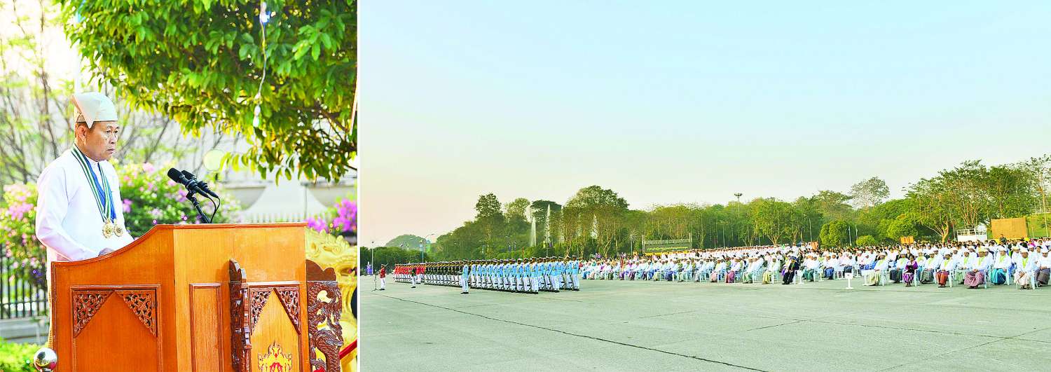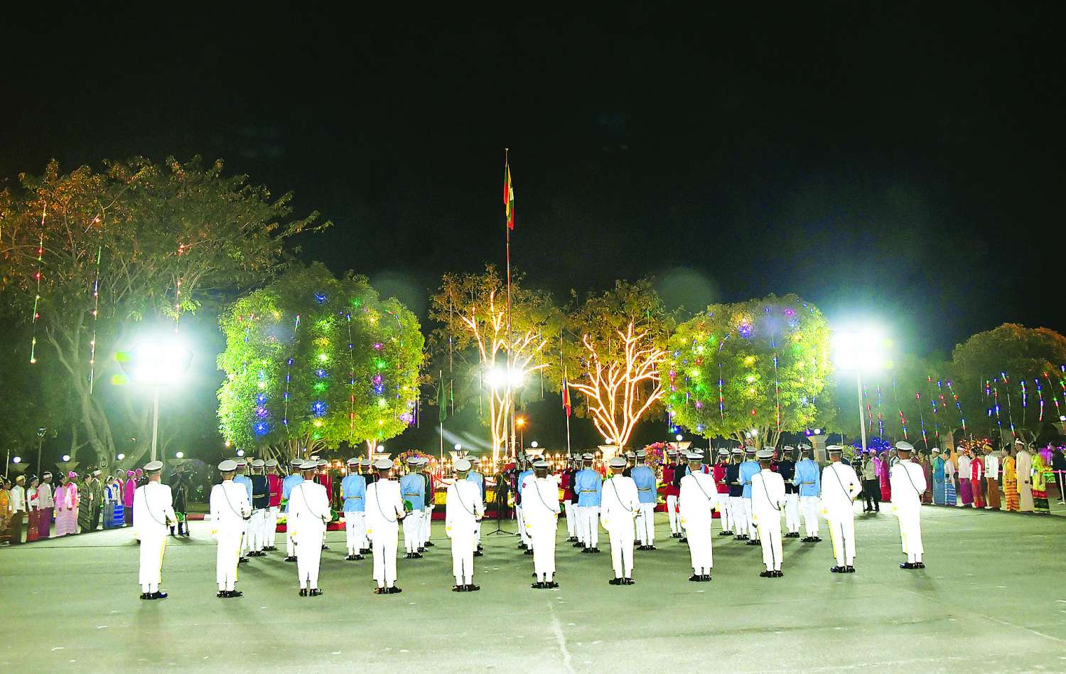 ထို့နောက် နိုင်ငံတော်စီမံအုပ်ချုပ်ရေးကောင်စီဒုတိယဥက္ကဋ္ဌသည် တက်ရောက်လာကြသူများနှင့်အတူ ပြည်ထောင်စုသမ္မတမြန်မာနိုင်ငံတော်အလံကိုအလေးပြုရာ ဂုဏ်ပြုတပ်ဖွဲ့က နိုင်ငံတော်သီချင်းကို တီးမှုတ်သည်။