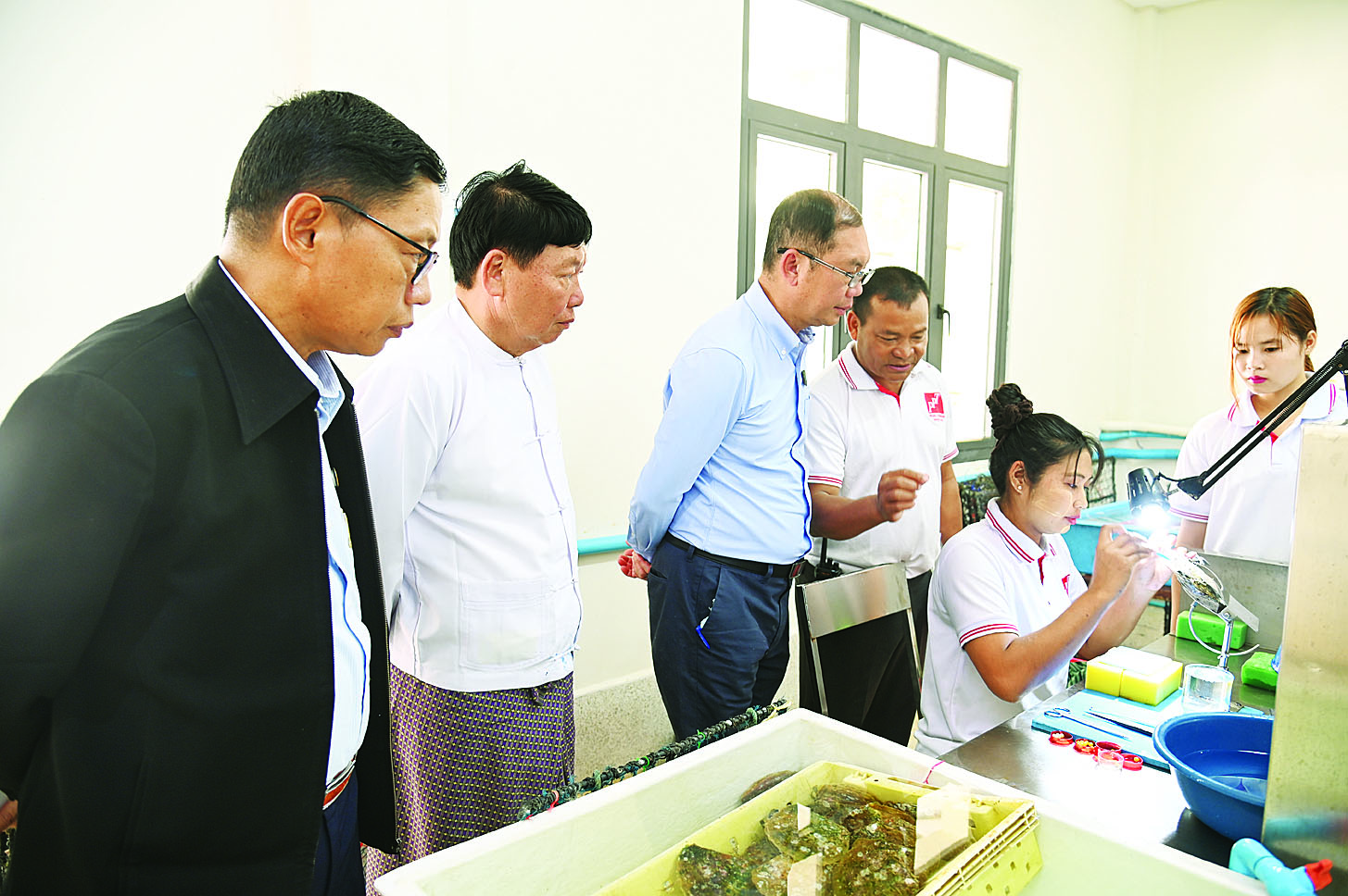 ဆက်လက်၍ ပြည်ထောင်စုဝန်ကြီးသည် ကျွန်းစုမြို့နယ် ဒိုမယ်ကျွန်းရှိ မြန်မာတာဆာကီကုမ္ပဏီ၏ ပုလဲမွေးမြူထုတ်လုပ်နေမှု လုပ်ငန်းအဆင့်ဆင့်နှင့် ယခုလအတွင်း ပုလဲဖော်ထုတ်ခြင်းမှရရှိလာသော ပုလဲများအား အရည်အသွေးအလိုက်၊ အရွယ်အစားအလိုက်ခွဲခြားပြသထားမှုကို ကြည့်ရှုစစ်ဆေးသည်။
