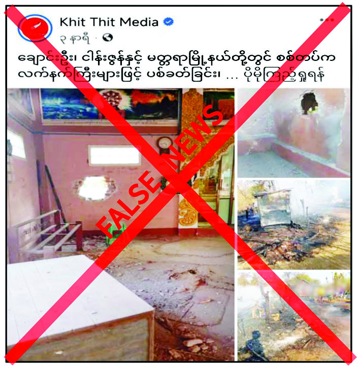 ချောင်းဦး၊ ငါန်းဇွန်နှင့် မတ္တရာမြို့နယ်တို့တွင် လုံခြုံရေးအဖွဲ့ဝင်များက လက်နက်ကြီး၊ လေကြောင်းတိုက်ခိုက်မှုများကြောင့် ပြည်သူနှစ်ဦးသေဆုံးပြီး သာသနိကအဆောက်အအုံများ ပျက်စီးခဲ့ကြောင်း မဟုတ်မမှန်လုပ်ကြံဝါဒဖြန့်လျက်ရှိ