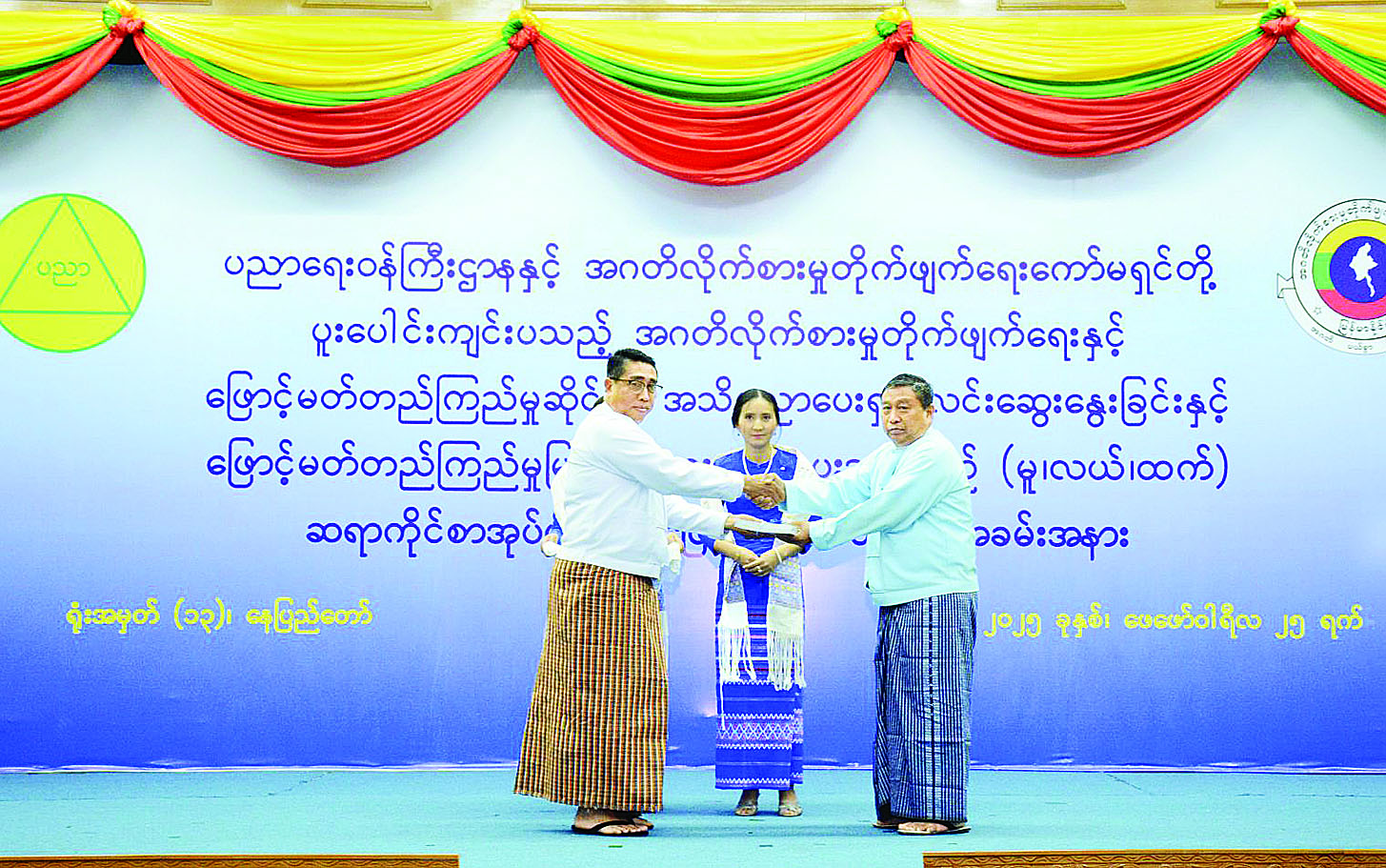 ယင်းနောက် အဂတိလိုက်စားမှုတိုက်ဖျက်ရေးကော်မရှင် အတွင်းရေးမှူးက ပညာရေးဝန်ကြီးဌာန ဒုတိယဝန်ကြီးကို ဖြောင့်မတ်တည်ကြည်မှုမြှင့်တင်ရေးပညာပေးအစီအစဉ် (မူ၊ လယ်၊ ထက်) ဆရာကိုင်စာအုပ်များ လွှဲပြောင်းပေးအပ်သည်။