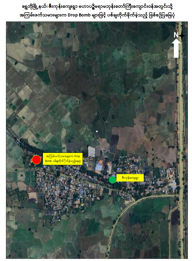 PDF အမည်ခံအကြမ်းဖက်အဖွဲ့က စစ်ရေးပစ်မှတ်မဟုတ်သည့် စစ်ကိုင်းတိုင်းဒေသကြီး၊ ရွှေဘိုမြို့နယ်၊ ဇီးကုန်းကျေးရွာရှိ မဟာပဉ္စမရာမဘုန်းတော်ကြီးကျောင်းဝန်းအတွင်းသို့ Drop Bomb များဖြင့် ပစ်ချတိုက်ခိုက်ခဲ့မှုကြောင့် ဒေသခံပြည်သူများ ထိခိုက်သေဆုံးခဲ့ပြီး ကိုရင်များဒဏ်ရာများရရှိခဲ့ကြောင်း သိရှိရသည်။