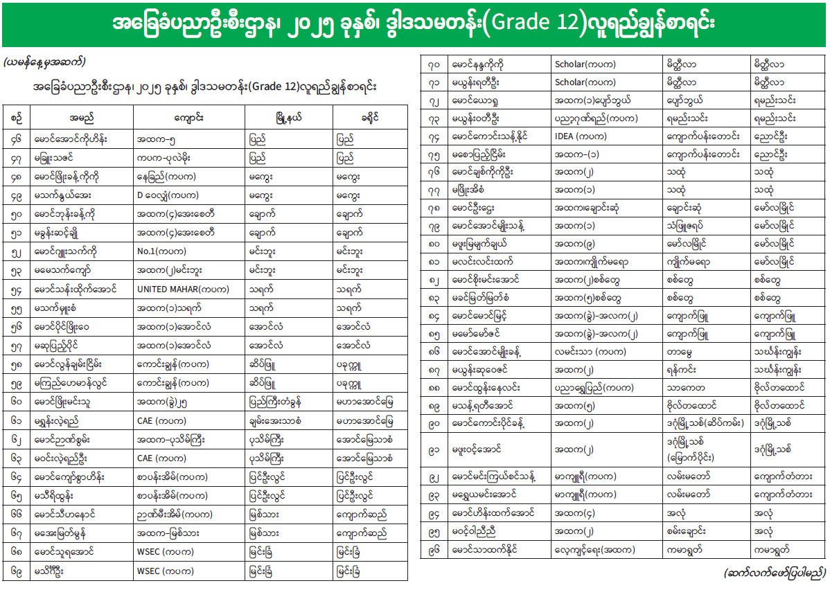 အခြေခံပညာဦးစီးဌာန၊ ၂၀၂၅ ခုနှစ်၊ ဒွါဒသမတန်း(Grade 12)လူရည်ချွန်စာရင်း