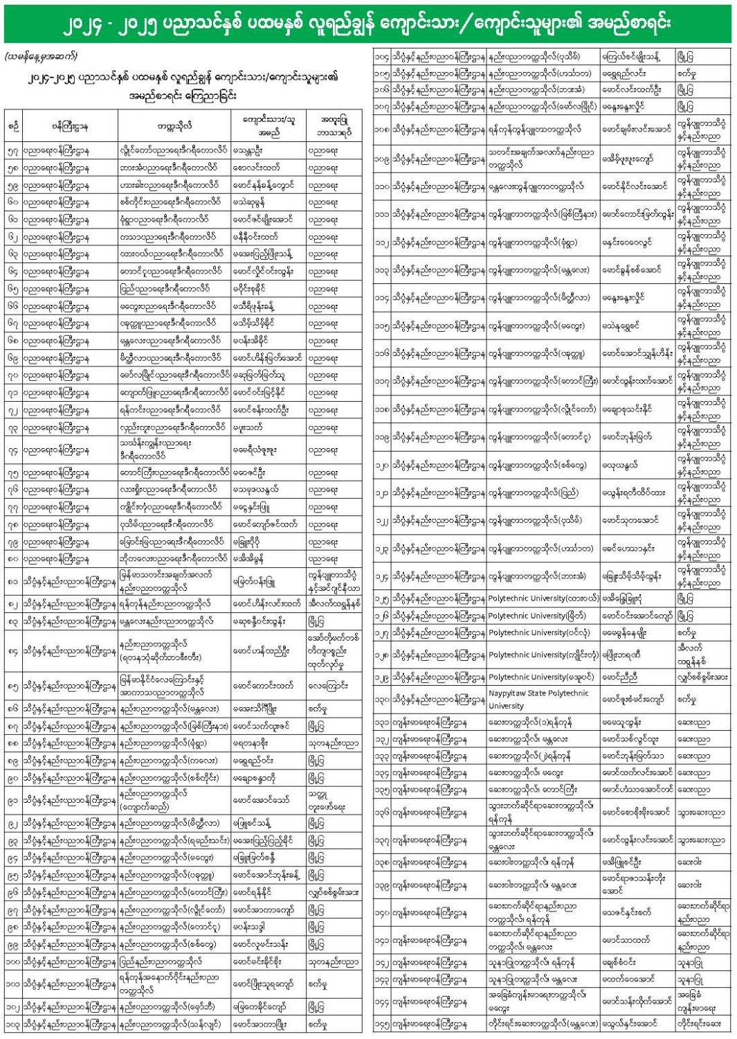 ၂၀၂၄ - ၂၀၂၅ ပညာသင်နှစ် ပထမနှစ် လူရည်ချွန် ကျောင်းသား/ကျောင်းသူများ၏ အမည်စာရင်း