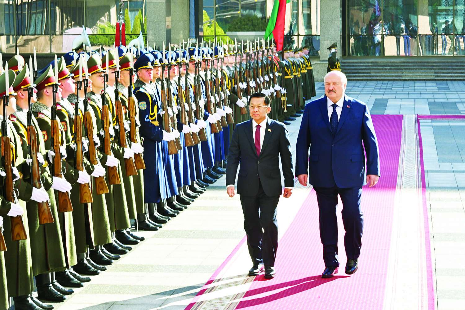 ဘယ်လာရုစ်သမ္မတနိုင်ငံသမ္မတH.E. Mr. Alexander Gregoryevich Lukashenko ၏ ဖိတ်ကြားချက်အရ ဘယ်လာရုစ်နိုင်ငံသို့ နိုင်ငံတော်အဆင့် (Official State Visit) ချစ်ကြည်ရေးခရီးရောက်ရှိနေသည့် နိုင်ငံတော်စီမံအုပ်ချုပ်ရေးကောင်စီဥက္ကဋ္ဌ နိုင်ငံတော်ဝန်ကြီးချုပ် ဗိုလ်ချုပ်မှူးကြီး မင်းအောင်လှိုင်အား ယနေ့ဒေသစံတော်ချိန် နံနက်ပိုင်းတွင် ဘယ်လာရုစ်နိုင်ငံသမ္မတက သမ္မတနန်းတော်၌ ဂုဏ်ပြုတပ်ဖွဲ့ဖြင့် ကြိုဆိုသည်။