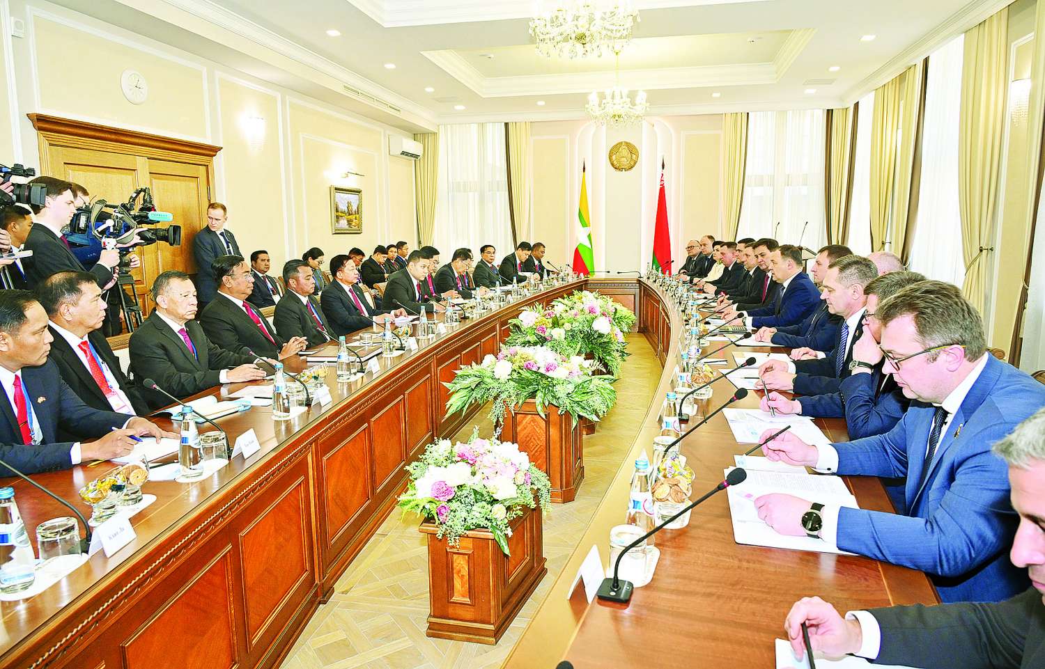 ဘယ်လာရုစ်သမ္မတနိုင်ငံ မင့်စ်မြို့၌ နိုင်ငံတော်အဆင့် ချစ်ကြည်ရေးခရီးရောက်ရှိနေသည့် နိုင်ငံတော်စီမံအုပ်ချုပ်ရေးကောင်စီဥက္ကဋ္ဌ နိုင်ငံတော်ဝန်ကြီးချုပ် ဗိုလ်ချုပ်မှူးကြီး မင်းအောင်လှိုင်သည် ဘယ်လာရုစ်သမ္မတနိုင်ငံဝန်ကြီးချုပ် H.E. Mr. Roman Alexand-rovich Golovchenko နှင့် ယနေ့ဒေသစံတော်ချိန် ညနေပိုင်းတွင် ဝန်ကြီးချုပ်ရုံးအစည်းအဝေးခန်းမ၌ တွေ့ဆုံဆွေးနွေးသည်။