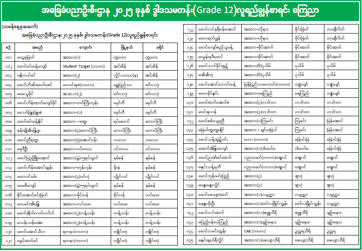 အခြေခံပညာဦးစီးဌာန ၂၀၂၅ ခုနှစ် ဒွါဒသမတန်း(Grade 12)လူရည်ချွန်စာရင်း ကြေညာ