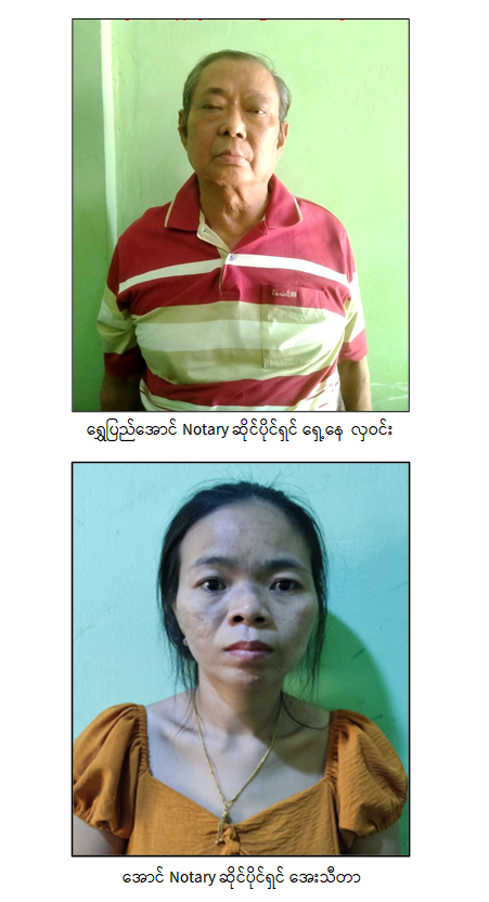 ၎င်းတို့၏စိစစ်ရရှိချက်များအရ ၂၀၂၄ ခုနှစ်၊ နိုဝင်ဘာလတွင် ကေဇင်ထွန်းမှ အိလဲ့လဲ့ထွန်း (Angel Online Notary Service) အား ဆက်သွယ်၍ ၎င်း၏ အကြမ်းဖက်အုပ်စုအဖြစ်ကြေညာထားသော NUG အဖွဲ့လက်အောက်ခံ တရားမဝင်ဆေးတက္ကသိုလ် (မန္တလေး) မှ ယာယီဆေးပညာဘွဲ့လက်မှတ် (အတု) အား Notary (သက်သေခံချက်) ပြုလုပ်ပေးရန် ငွေကြေးပေး၍စေခိုင်းခဲ့ကြောင်း၊ အိလဲ့လဲ့ထွန်းမှ ကေဇင်ထွန်း၏ဘွဲ့လက်မှတ် (အတု) အား Notary (သက်သေခံချက်) ပြုလုပ်ရန်နှင့် Notary ဌာနစိတ် (ရန်ကုန်) မှ ထပ်ဆင့်လက်မှတ်ရရှိရန် ဇာနည်လွင် (ခ) လပြည့် (လပြည့်ဝန်း Notary ဆိုင်ပိုင်ရှင်) အား ငွေကြေးပေး၍ ထပ်မံစေခိုင်းခဲ့ကြောင်း၊ ဇာနည်လွင် (ခ) လပြည့်သည် ၎င်း Notary (သက်သေခံချက်) (အတု) အား ရှေ့နေလှဝင်း (ရွှေပြည်အောင် Notary ဆိုင်ပိုင်ရှင်) ထံသို့ ငွေကြေးပေး၍ ရှေ့နေလက်မှတ်ရေးထိုးစေခဲ့ပြီး အေးသီတာ (အောင် Notary ဆိုင်ပိုင်ရှင်) နှင့်ချိတ်ဆက်၍ နိုင်ငံခြားရေးဝန်ကြီးဌာနမှ ထပ်ဆင့်လက်မှတ်ရရှိနိုင်ရန် ငွေကြေးပေး၍စေခိုင်းခဲ့ကြောင်း၊ အေးသီတာသည် ၎င်း Notary (သက်သေခံချက်) (အတု) အား နိုင်ငံခြားရေးဝန်ကြီးဌာန၊ နိုတြီဌာနစိတ် (ရန်ကုန်) တွင် လက်မှတ်ရေးထိုးနိုင်ရန် ပွဲစားခိုင်ခိုင် (ထွက်ပြေးတိမ်းရှောင်) အား ငွေကြေးပေး၍စေခိုင်းခဲ့ကြောင်း သိရှိရပါသည်။