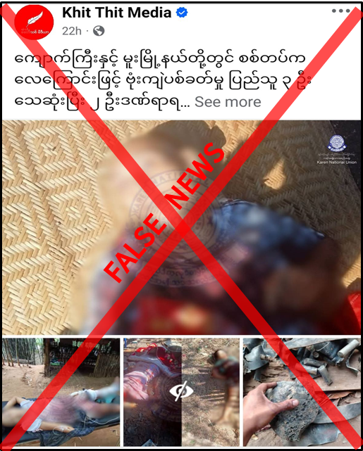 ပဲခူးတိုင်းဒေသကြီး၊ ကျောက်ကြီးမြို့နယ်နှင့် မူးမြို့နယ်တို့တွင် လုံခြုံရေးတပ်ဖွဲ့များမှ မတ်လ ၆ ရက်နေ့တွင် လေကြောင်းဖြင့် ဗုံးကြဲတိုက်ခိုက်မှုကြောင့် ပြည်သူ ၃ ဦး သေဆုံး၊ ၂ ဦး ဒဏ်ရာရခဲ့ပြီး နေအိမ်များပျက်စီးခဲ့ကြောင်း မဟုတ်မမှန်ရေးသားဖြန့်ဝေလျက်ရှိကြောင်း တွေ့ရှိရသည်။