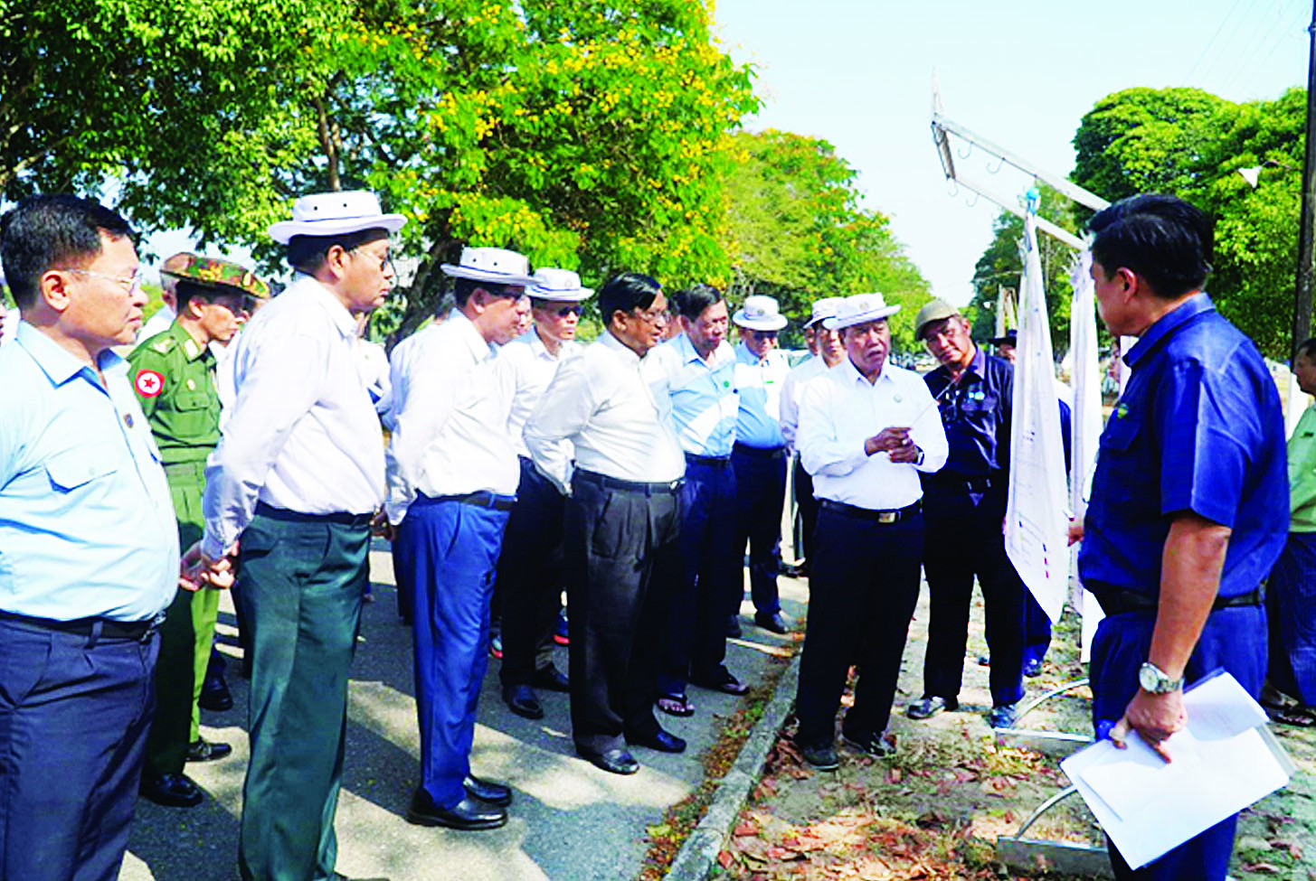 စက်မှုဝန်ကြီးဌာန ပြည်ထောင်စုဝန်ကြီး ဒေါက်တာချာလီသန်းနှင့် ရန်ကုန်တိုင်းဒေသကြီးဝန်ကြီးချုပ် ဦးစိုးသိန်းတို့သည် ယနေ့နံနက်ပိုင်းတွင် ပြည်ထောင်စုအဆင့် MSME ထုတ်ကုန်ပြပွဲ(ရန်ကုန်)ကျင်းပမည့် ကျိုက္ကဆံကွင်းသို့ရောက်ရှိရာ မြို့တော်ဝန်နှင့် တာဝန်ရှိသူများက ပြပွဲကျင်းပပြုလုပ်နိုင်ရေးအတွက် စီမံဆောင်ရွက်ထားရှိမှုအခြေအနေများကို အကွက်ချပုံစံများဖြင့် ရှင်းလင်းတင်ပြသည်။