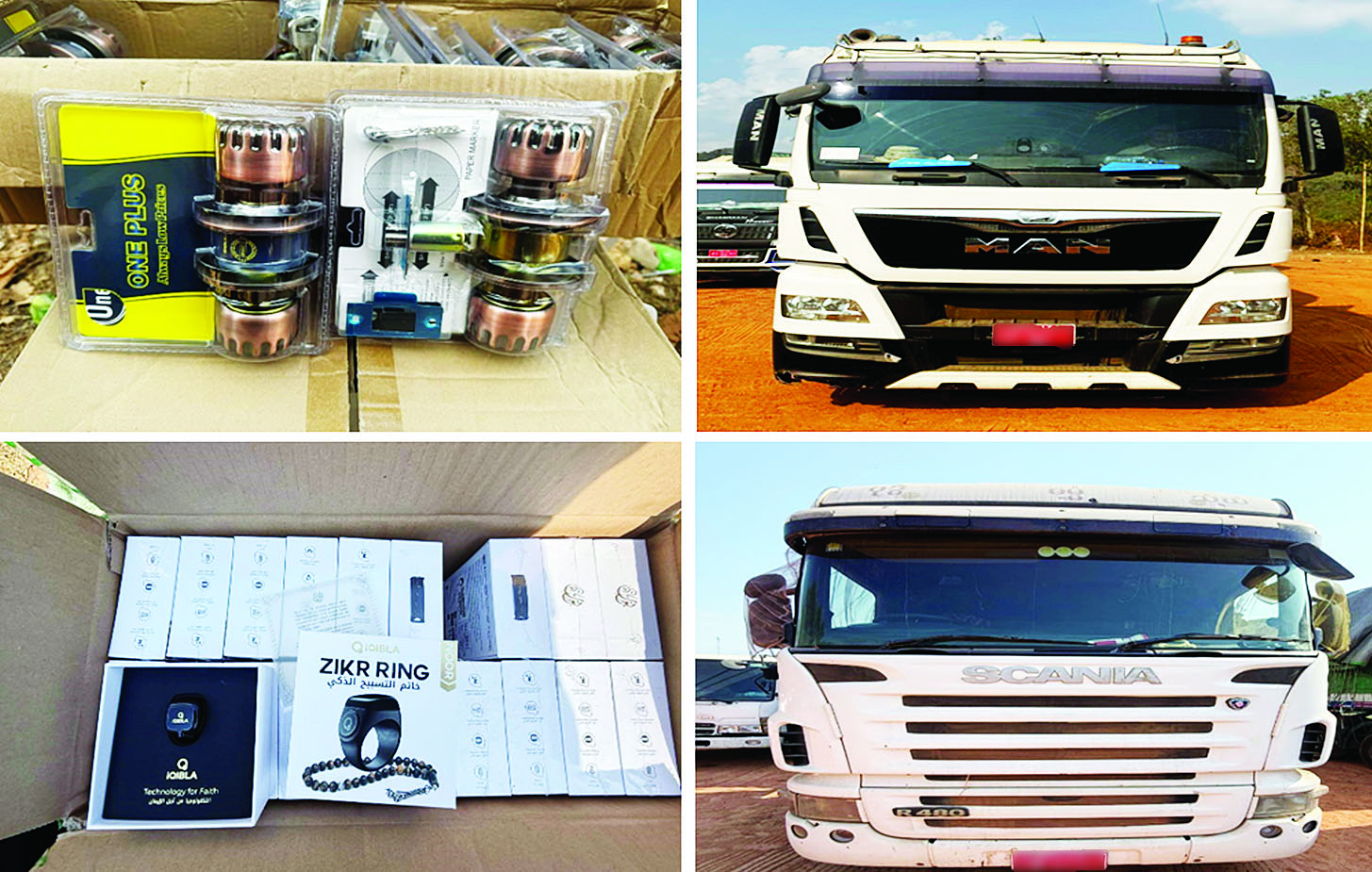 Nissan Diesel Truck နှစ်စီး၊ Hino Truck တစ်စီး၊ စက်မှုဇုန်ထုတ် Tun Hlaing Truck တစ်စီး၊ Nidi Truck တစ်စီး၊ Super Mandalar Truck တစ်စီး၊ Man Tractor Head သုံးစီး၊ Scania Tractor Head တစ်စီး၊ Volvo Tractor Head တစ်စီး၊ Nissan Diesel Tractor Head တစ်စီး၊ Chenglong Tractor Head တစ်စီး၊ Mitsubishi Fuso Tractor Head တစ်စီး၊ Dong Feng Tractor Head တစ်စီး၊ Shacman Tractor Head တစ်စီးနှင့် နောက်တွဲယာဉ် ၁၀ တွဲ (ခန့်မှန်း တန်ဖိုးငွေကျပ် ၉၈၅၀၀၀၀၀၀) စုစုပေါင်း ခန့်မှန်းတန်ဖိုး ငွေကျပ် ၁၅၀၇၉၈၀၃၀၀ ကို ဖမ်းဆီးရမိခဲ့ပြီး အကောက်ခွန်လုပ်ထုံး လုပ်နည်းများနှင့်အညီ အရေးယူဆောင်ရွက်လျက်ရှိသည်။
