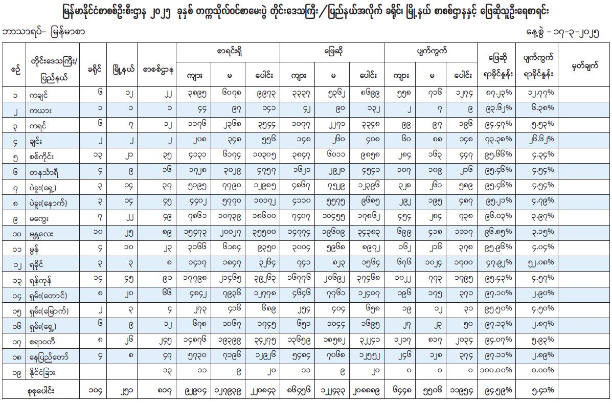 ယခုနှစ်တွင် နိုင်ငံခြား စာစစ်ဌာန ၁၃ ခုနှင့် ပြည်တွင်းစာစစ်ဌာန ၈၀၄ ခု စာစစ်ဌာန စုစုပေါင်း ၈၁၇ခု ဖွင့်လှစ်ဖြေဆိုခဲ့ရာ စာမေးပွဲဖြေဆိုရန် စာရင်းပေးသွင်းသူဦးရေ စုစုပေါင်း ၂၂၀၈၄၃ ဦးရှိပြီး စာမေးပွဲပထမနေ့ မြန်မာစာဘာသာရပ်လာရောက်ဖြေဆိုသူ စုစုပေါင်း ၂၀၈၈၈၉ ဦး၊ ပျက်ကွက် ၁၁၉၅၄ ဦးရှိကာ ဖြေဆိုသူ ၉၄ ဒသမ ၅၉ ရာခိုင်နှုန်းရှိကြောင်း ပညာရေးဝန်ကြီးဌာနမှ သိရသည်။