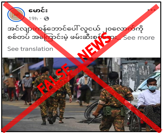 ရန်ကုန်တိုင်းဒေသကြီး၊ ကမ္ဘာအေးဘုရားလမ်းမပေါ်ရှိ အင်လျားကန်ဘောင်တွင် လုံခြုံရေးတပ်ဖွဲ့ဝင်များမှ လူငယ် ၂၀ ဦးခန့်ကို အကြောင်းမဲ့ဖမ်းဆီးစစ်ဆေးခဲ့ပြီး ၆ ဦးခန့်ကို ဖမ်းဆီးခေါ်ဆောင်သွားကြောင်း တရားမဝင်ပြည်ဖျက်မီဒီယာများက သတင်းတု၊ သတင်းအမှားများ မဟုတ်မမှန် လုပ်ကြံရေးသား ဝါဒဖြန့်ဝေလျက်ရှိပါသည်။