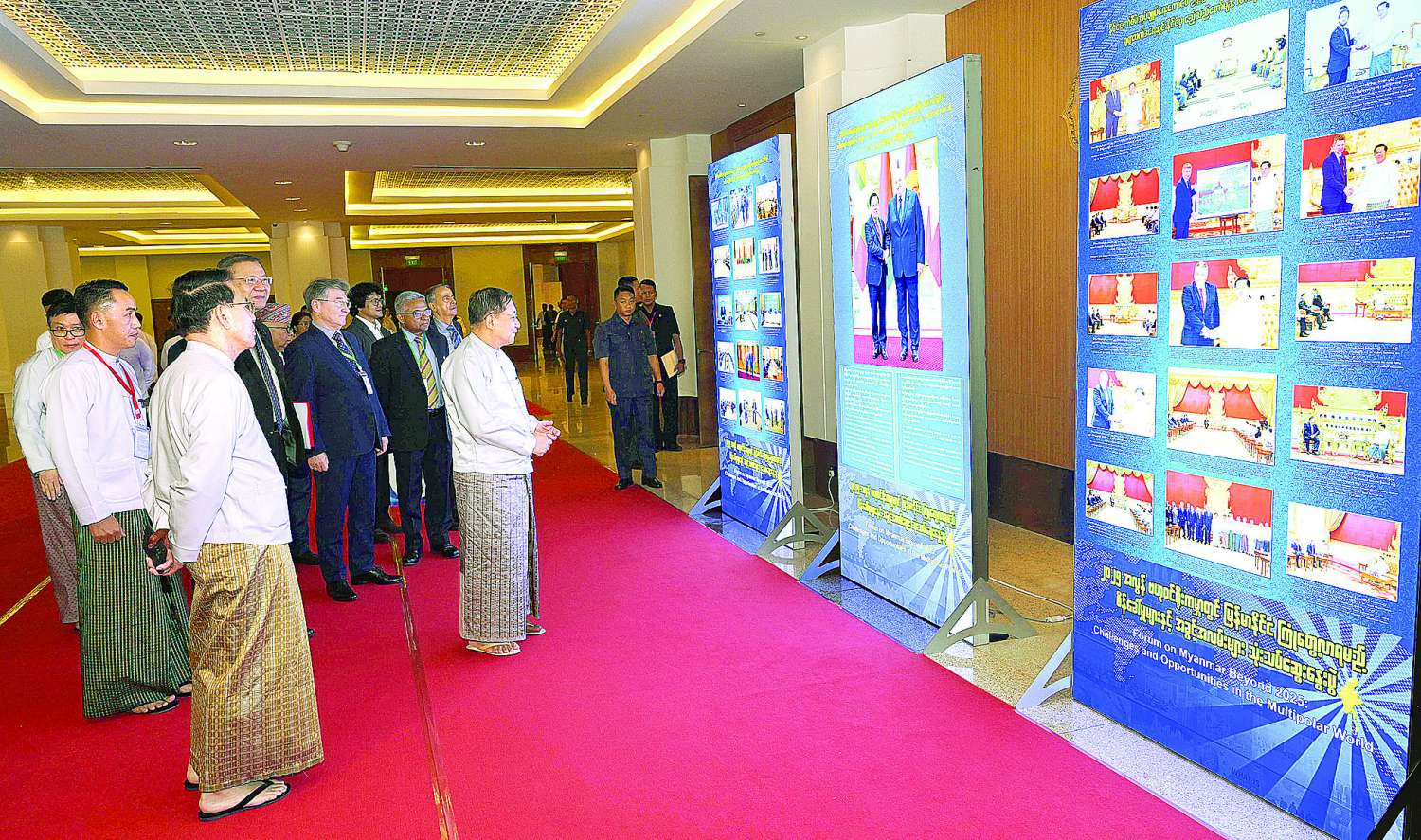 ဖွင့်ပွဲအခမ်းအနားအပြီးတွင် နိုင်ငံတော်စီမံအုပ်ချုပ်ရေးကောင်စီဥက္ကဋ္ဌ နိုင်ငံတော်ဝန်ကြီးချုပ်နှင့် အခမ်းအနားတက်ရောက်လာကြသူများသည် မှတ်တမ်းတင်စုပေါင်းဓာတ်ပုံရိုက်ကြပြီး ခင်းကျင်း ပြသထားသည့် မှတ်တမ်းဓာတ်ပုံများအား ကြည့်ရှုခဲ့ကြသည်။
