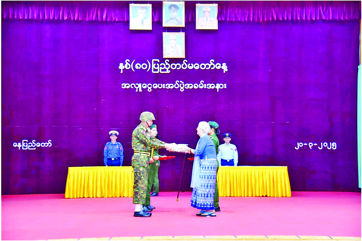 နှစ် (၈၀) ပြည့် တပ်မတော်နေ့ကို ကြိုဆိုဂုဏ်ပြုသောအားဖြင့် စေတနာရှင် အလှူရှင်များက ဂုဏ်ပြုအလှူငွေများ ပေးအပ်လှူဒါန်းပွဲကို ယနေ့မွန်းလွဲပိုင်းတွင် နေပြည်တော် စစ်ကြောရေးနှင့် တည်းခိုရေးစခန်းရှိ ဆင်ဖြူရှင်ခန်းမ၌ ကျင်းပသည်။