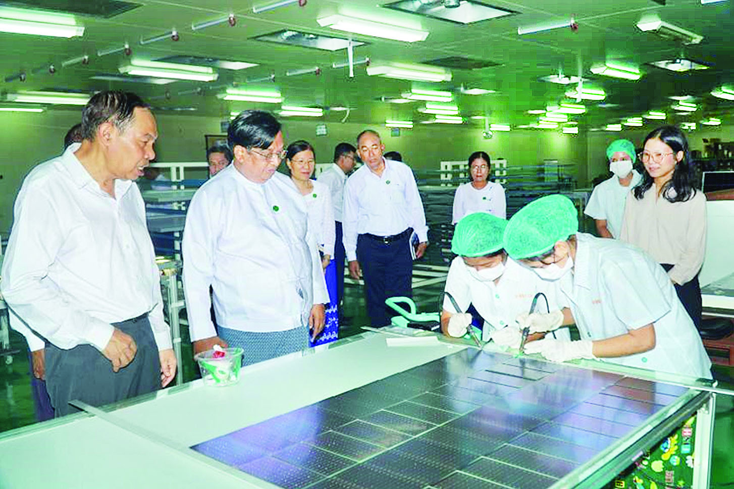 ယင်းနောက် ပြည်ထောင်စုဝန်ကြီးသည် လှိုင်မြို့နယ်ရှိ ရွှေကသာကုမ္ပဏီလီမိတက်သို့ ငှားရမ်းထားသည့် အီလက်ထရွန်နစ်ပစ္စည်းနှင့် လျှပ်စစ်မော်တာစက်ရုံသို့ရောက်ရှိပြီး ဆိုလာပြားများ တပ်ဆင်ထုတ်လုပ်နေသည့်လုပ်ငန်းစဉ်ကို ကြည့်ရှုစစ်ဆေးသည်။