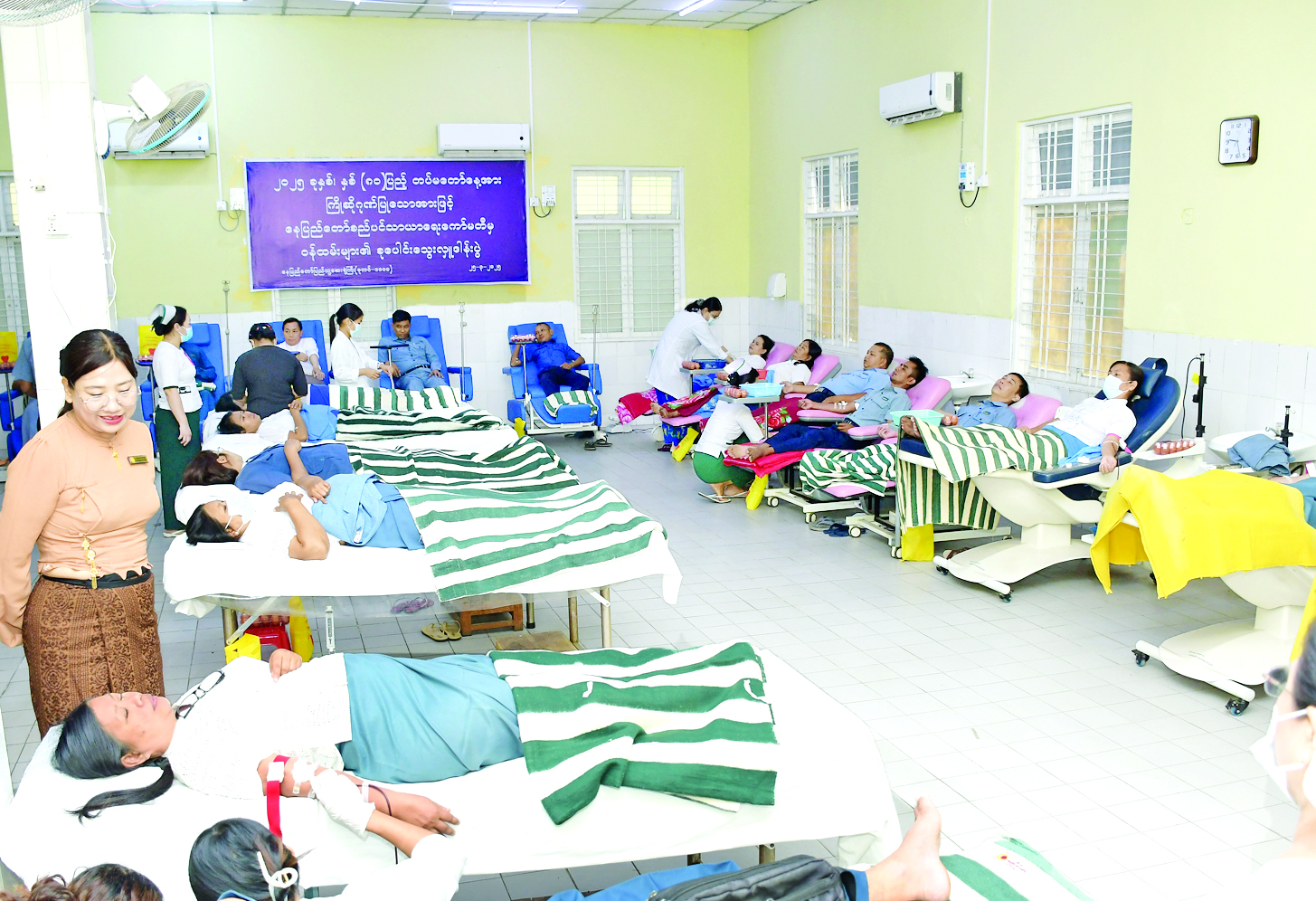 ယနေ့တွင် နေပြည်တော်စည်ပင်သာယာရေးကော်မတီမှ သွေးအလှူရှင်ဝန်ထမ်း ၄၆ ဦးတို့က စုပေါင်းသွေးလှူဒါန်းကြခြင်းဖြစ်ပြီး သွေးအလှူရှင်ဝန်ထမ်းများအား နေပြည်တော်ကောင်စီဝင် ဦးမြင့်စိုး၊ ဒုတိယမြို့တော်ဝန် ဦးမောင်မောင်နှင့် တာဝန်ရှိသူများက လိုက်လံကြည့်ရှုအားပေးကာ သွေးအလှူရှင်များအတွက် အာဟာရဖြည့်စားသောက်ဖွယ်ရာများ ချီးမြှင့်ပေးအပ်ကြသည်။