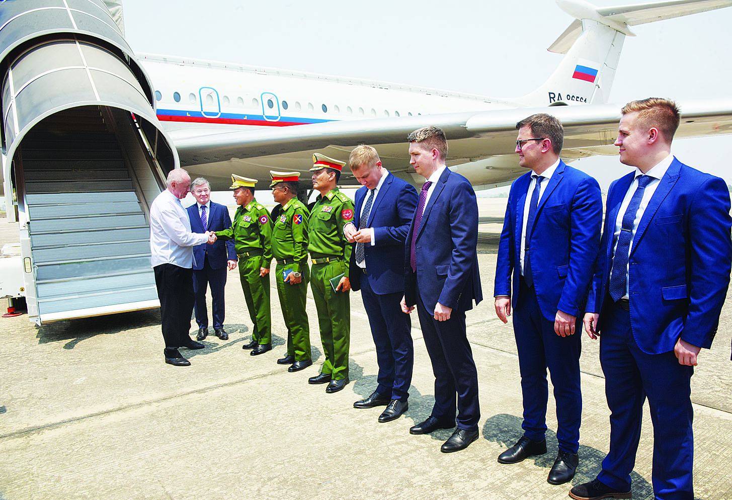အဆိုပါ ရုရှားဖက်ဒရေးရှင်းနိုင်ငံ ဒုတိယကာကွယ်ရေးဝန်ကြီး Colonel General Alexander Vasilyevich Fomin ဦးဆောင်သော ကိုယ်စားလှယ်အဖွဲ့အား နေပြည်တော်တိုင်း စစ်ဌာနချုပ်တိုင်းမှူး ဗိုလ်ချုပ် စိုးမင်းနှင့် တပ်မတော်အရာရှိကြီးများက လေဆိပ်၌ကြိုဆိုနှုတ်ဆက် ကြသည်။