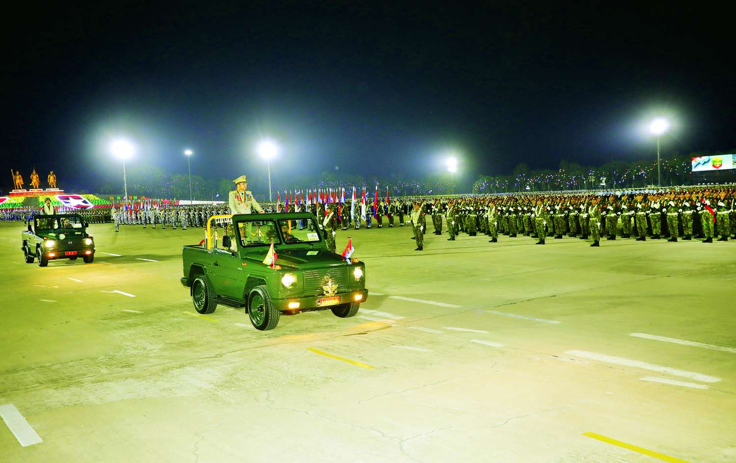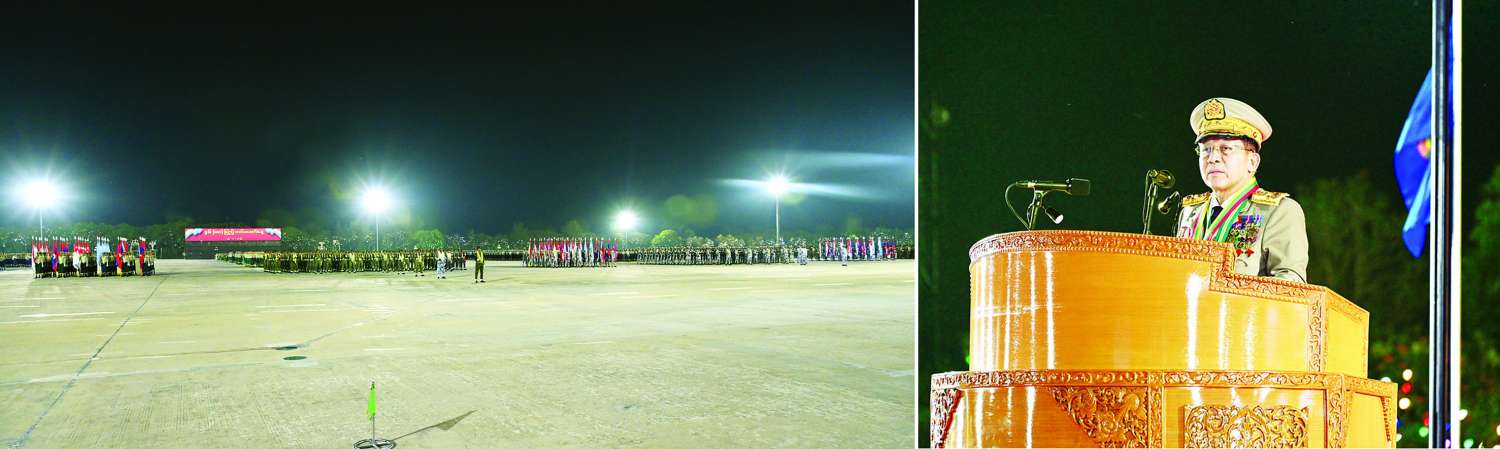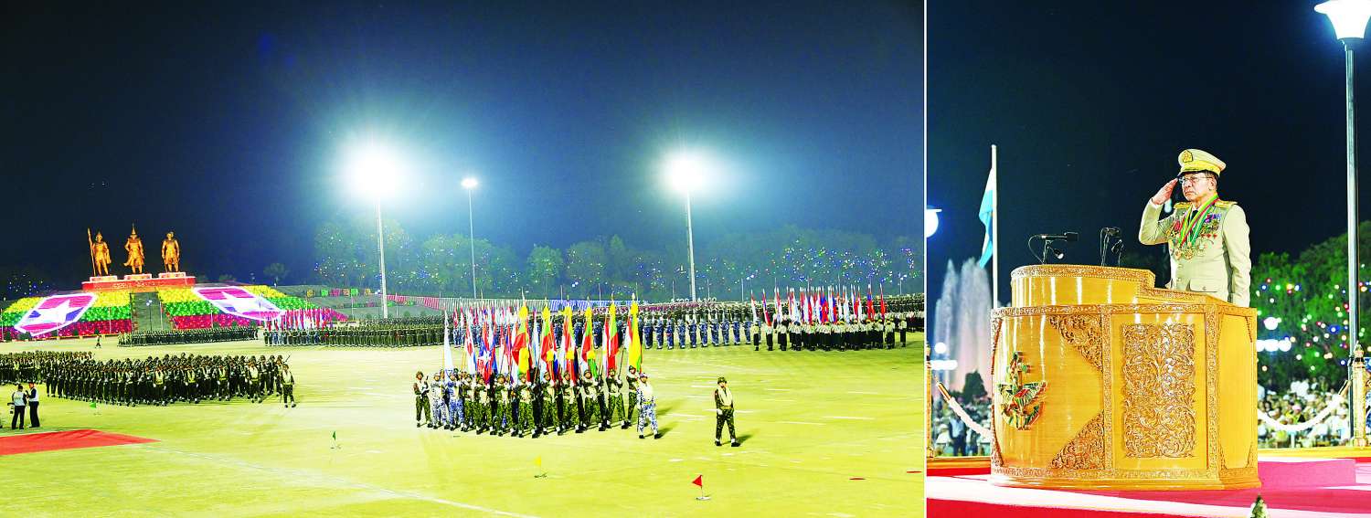 နှစ်(၈ဝ)ပြည့် တပ်မတော်နေ့ စစ်ရေးပြအခမ်းအနား ကျင်းပပြုလုပ်၊ နိုင်ငံတော်စီမံအုပ်ချုပ်ရေးကောင်စီဥက္ကဋ္ဌ တပ်မတော်ကာကွယ်ရေးဦးစီးချုပ် ဗိုလ်ချုပ်မှူးကြီး သတိုးမဟာသရေစည်သူ သတိုးသီရိသုဓမ္မ မင်းအောင်လှိုင် တက်ရောက်မိန့်ခွန်းပြောကြား