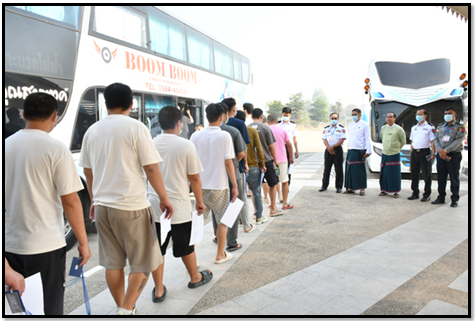 မြန်မာ - တရုတ် - ထိုင်း သုံးနိုင်ငံအကြား သုံးပွင့်ဆိုင်ပူးပေါင်းဆောင်ရွက်မှုပုံစံ (Trilateral Cooperation) ဖြင့် အွန်လိုင်းအသုံးပြုလိမ်လည်မှု (Online Scam) နှင့် အွန်လိုင်းလောင်းကစားမှု (Online Gambling) လုပ်ဆောင်နေကြသူများ၊ ပါဝင်ပတ်သက်သူများနှင့် နောက်ကွယ်မှကြိုးကိုင်သော ပြည်ပနိုင်ငံသားများကို ပြတ်ပြတ်သားသား စုံစမ်းဖော်ထုတ်တိုက်ဖျက်လျက်ရှိရာ ယနေ့တွင် အဆိုပါလုပ်ငန်းများ၌ ဆက်စပ်ပါဝင်ခဲ့ကြသည့် တရုတ်နိုင်ငံသား ၃၆၅ ဦးကို မြန်မာ - ထိုင်း အမှတ်(၂) ချစ်ကြည်ရေးတံတားမှတစ်ဆင့် သက်ဆိုင်ရာနိုင်ငံသို့ လူသားချင်းစာနာထောက်ထားမှုနှင့် နိုင်ငံအချင်းချင်း ချစ်ကြည်ရင်းနှီးမှုတို့ကို ရှေးရှု၍ ဥပဒေလုပ်ထုံးလုပ်နည်းများနှင့်အညီ ထပ်မံပြည်နှင်လွှဲပြောင်းပေးသည်။