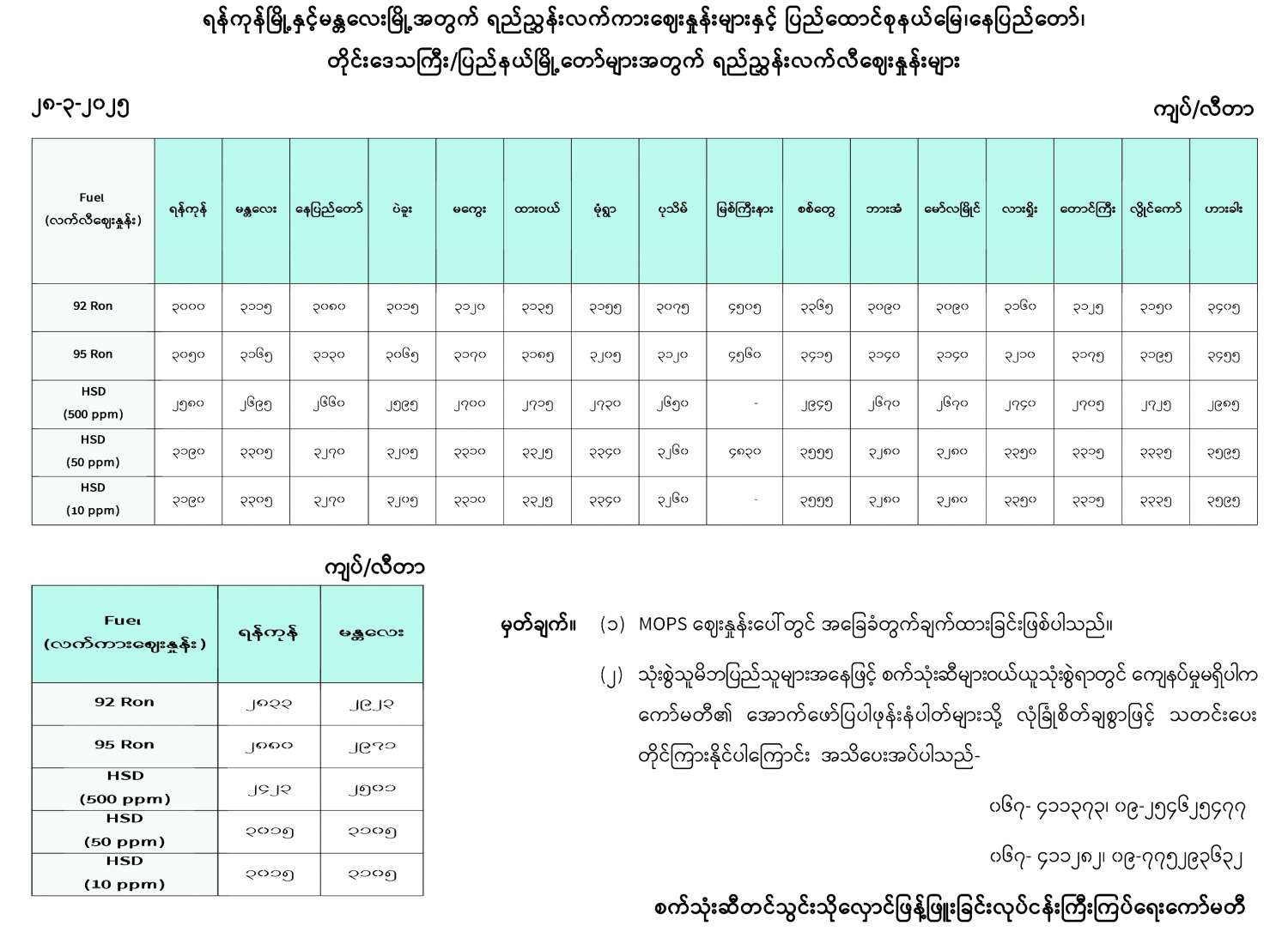 ရန်ကုန်မြို့နှင့် မန္တလေးမြို့အတွက် ရည်ညွှန်းလက်ကားဈေးနှုန်းများနှင့် ပြည်ထောင်စုနယ်မြေ နေပြည်တော်၊ တိုင်းဒေသကြီး/ပြည်နယ် မြို့တော်များအတွက် ရည်ညွှန်းလက်လီဈေးနှုန်းများ 03/28/2025