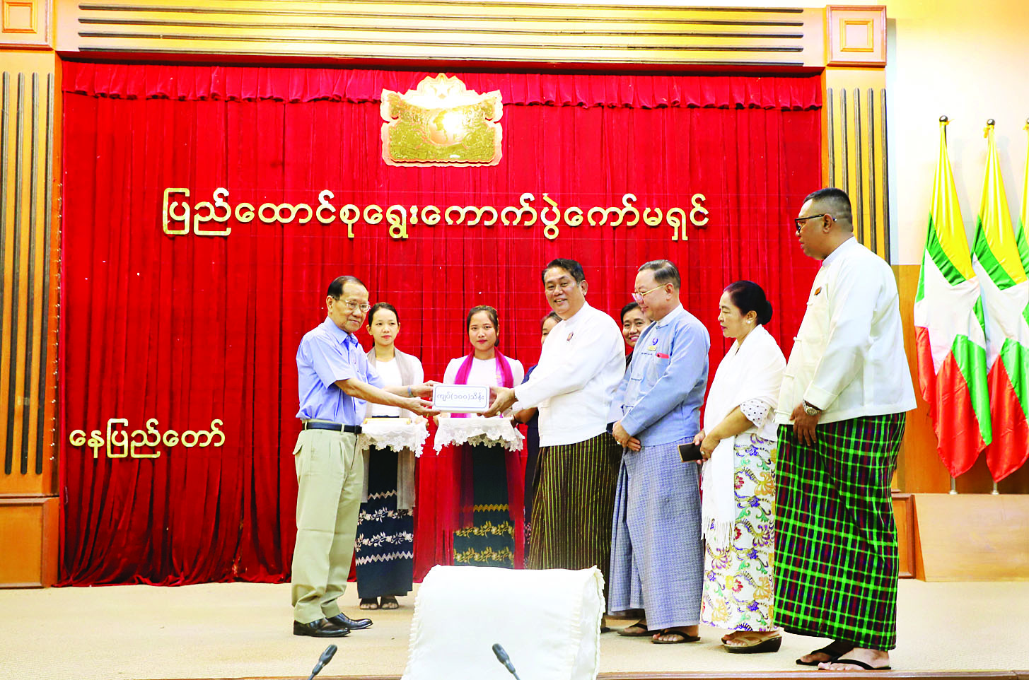 အခမ်းအနားတွင် လှူဒါန်းသည့် နိုင်ငံရေးပါတီ ၂၅ ပါတီမှ ကိုယ်စားလှယ်များက ငွေကျပ် သိန်း ၁၀၀ အား ပေးအပ်လှူဒါန်းရာ ပြည်ထောင်စုရွေးကောက်ပွဲကော်မရှင်ဥက္ကဋ္ဌက လက်ခံရယူပြီး ဂုဏ်ပြုမှတ်တမ်းလွှာ ပြန်လည်ပေးအပ်သည်။