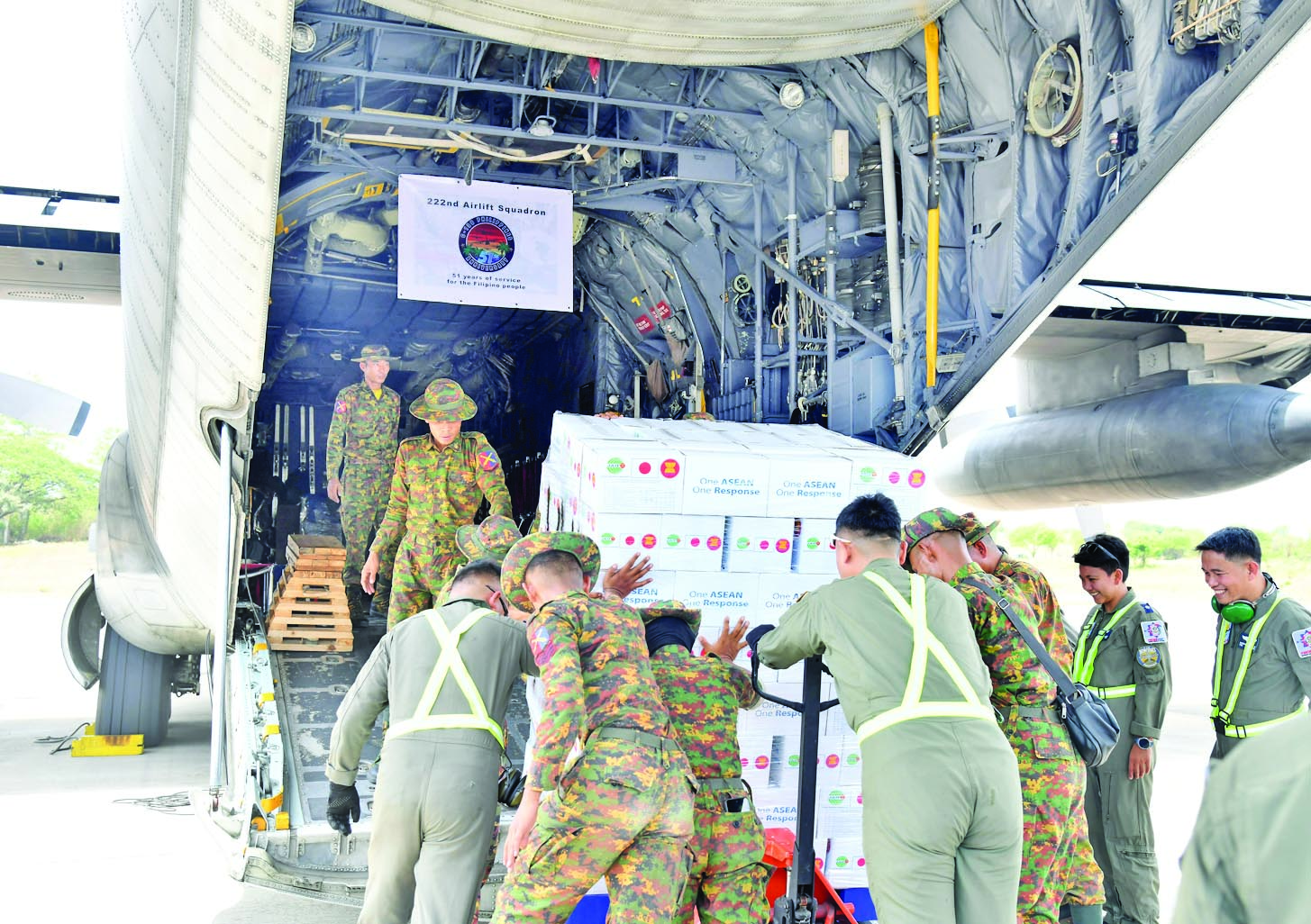 ASEAN AHA Centre မှ လှူဒါန်းသော လူသားချင်းစာနာထောက်ထားမှုဆိုင်ရာ အကူအညီပစ္စည်းများနှင့် လူသုံးကုန်ပစ္စည်းများ၊ စုစုပေါင်းပစ္စည်းတန်ချိန် ၅၀၁၃ ကီလိုဂရမ်အား ဖိလစ်ပိုင်နိုင်ငံမှ C-130 လေယာဉ်ဖြင့်တင်ဆောင်၍ ယနေ့နံနက် ၁၀ နာရီ ၁၆ မိနစ်အချိန်တွင်လည်းကောင်း၊ လူသားချင်းစာနာထောက်ထားမှုဆိုင်ရာ အကူအညီပစ္စည်း ၄၃၁၈ ကီလိုဂရမ်အား ဖိလစ်ပိုင်နိုင်ငံမှ C-130 လေယာဉ်ဖြင့်တင်ဆောင်၍ ယနေ့နံနက် ၁၁ နာရီ ၁၅ မိနစ်တွင်လည်းကောင်း၊ ကုန်တန်ချိန် ၁၄၆၉၁ ကီလိုဂရမ်အား မလေးရှားနိုင်ငံ MAI လေကြောင်းလိုင်းဖြင့်တင်ဆောင်၍ မွန်းလွဲ ၁ နာရီ ၁၃ မိနစ်တွင် နေပြည်တော်ရှိ တပ်မတော်လေဆိပ်သို့ အသီးသီးရောက်ရှိလာကြသည်။