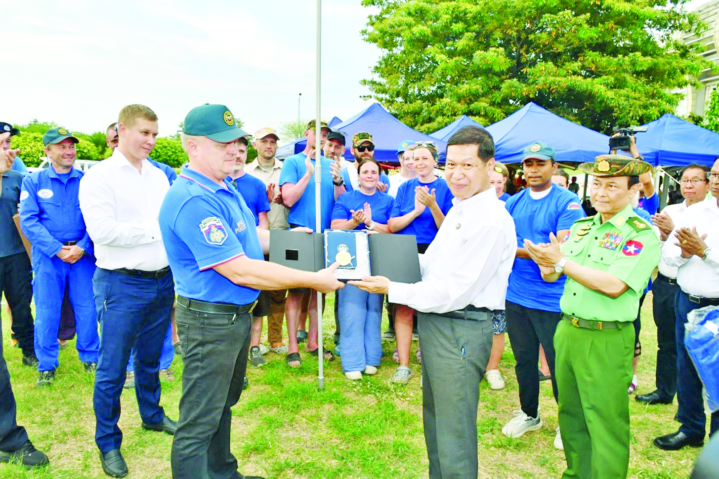 ဦးစွာ ဒုတိယဗိုလ်ချုပ်ကြီးစိုးတင့်နိုင်က ကျေးဇူးတင်စကား ပြောကြားသည်။ ထို့နောက်ရုရှားဖက်ဒရေးရှင်းနိုင်ငံမှ ကူညီကယ်ဆယ်ရေးနှင့် ဆေးကုသရေးအဖွဲ့အား ဂုဏ်ပြုမှတ်တမ်းလွှာနှင့် အမှတ်တရလက်ဆောင်ပစ္စည်းများ အပြန်အလှန်ပေးအပ်ကြပြီး ကူညီကယ်ဆယ်ရေးနှင့် ဆေးကုသရေးအဖွဲ့များအား ရင်းရင်းနှီးနှီးလိုက်လံနှုတ်ဆက်ခဲ့ကြကြောင်း သိရသည်။