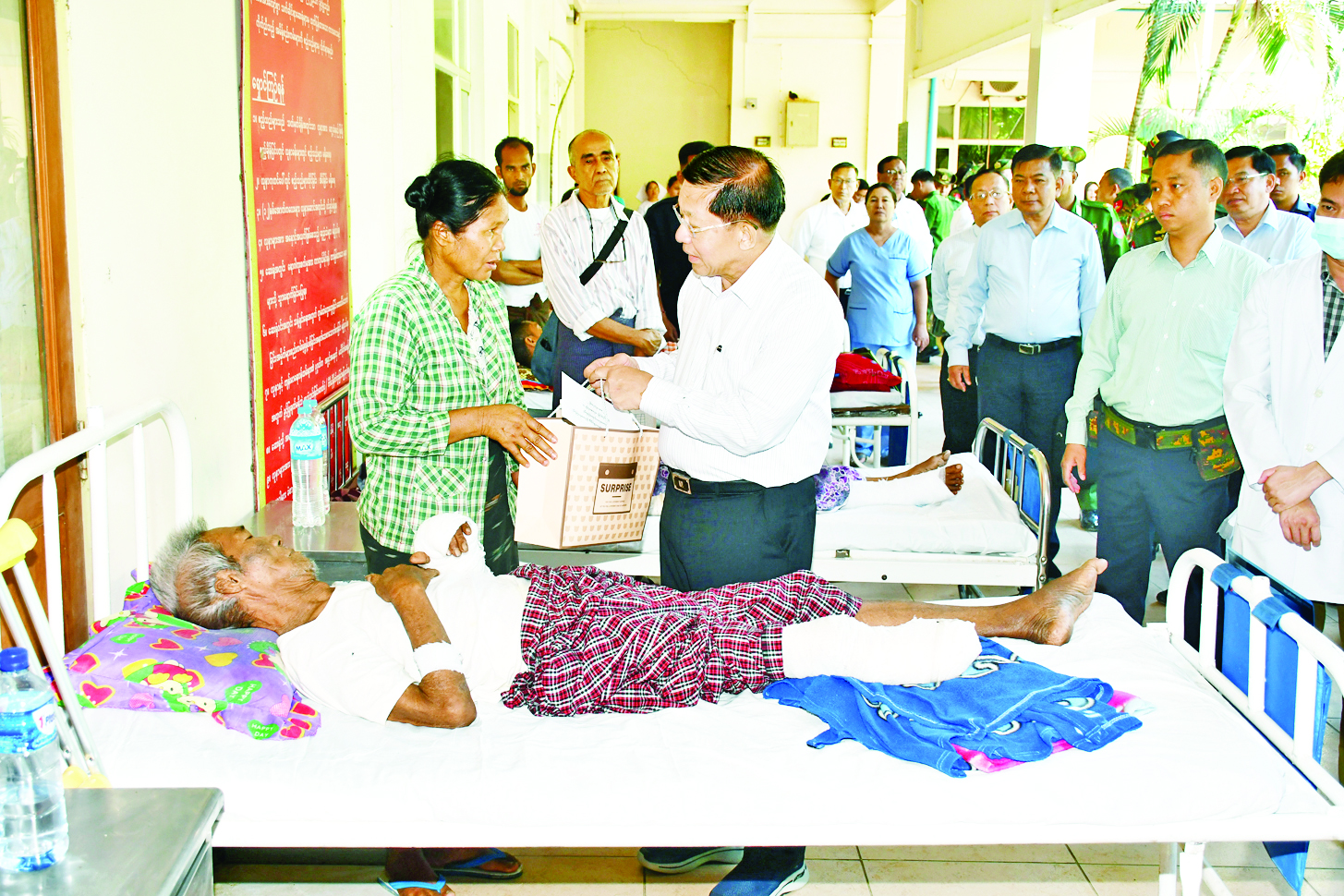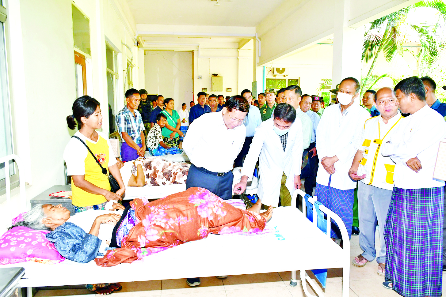 ဦးစွာ နိုင်ငံတော်စီမံအုပ်ချုပ်ရေးကောင်စီဥက္ကဋ္ဌ နိုင်ငံတော်ဝန်ကြီးချုပ်နှင့် အဖွဲ့ဝင်များသည် ကျောက်ဆည်မြို့ပြည်သူ့ဆေးရုံကြီး သို့ရောက်ရှိကြပြီး ငလျင်ဘေးဒဏ်ကြောင့် ထိခိုက်ဒဏ်ရာရရှိခဲ့သူများအား ဆေးဝါးကုသမှုဆောင်ရွက်ပေးနေမှုများနှင့် လူနာများအား လိုအပ်သည့် ကျန်းမာရေးစောင့်ရှောက်မှု ဆောင်ရွက်ပေးထားမှုများကို ကြည့်ရှု၍ အားပေးစကား ပြောကြားကာ ထိခိုက်ဒဏ်ရာရရှိသူများအတွက် ထောက်ပံ့ငွေများနှင့် စားသောက်ဖွယ်ရာများ ပေးအပ်သည်။
