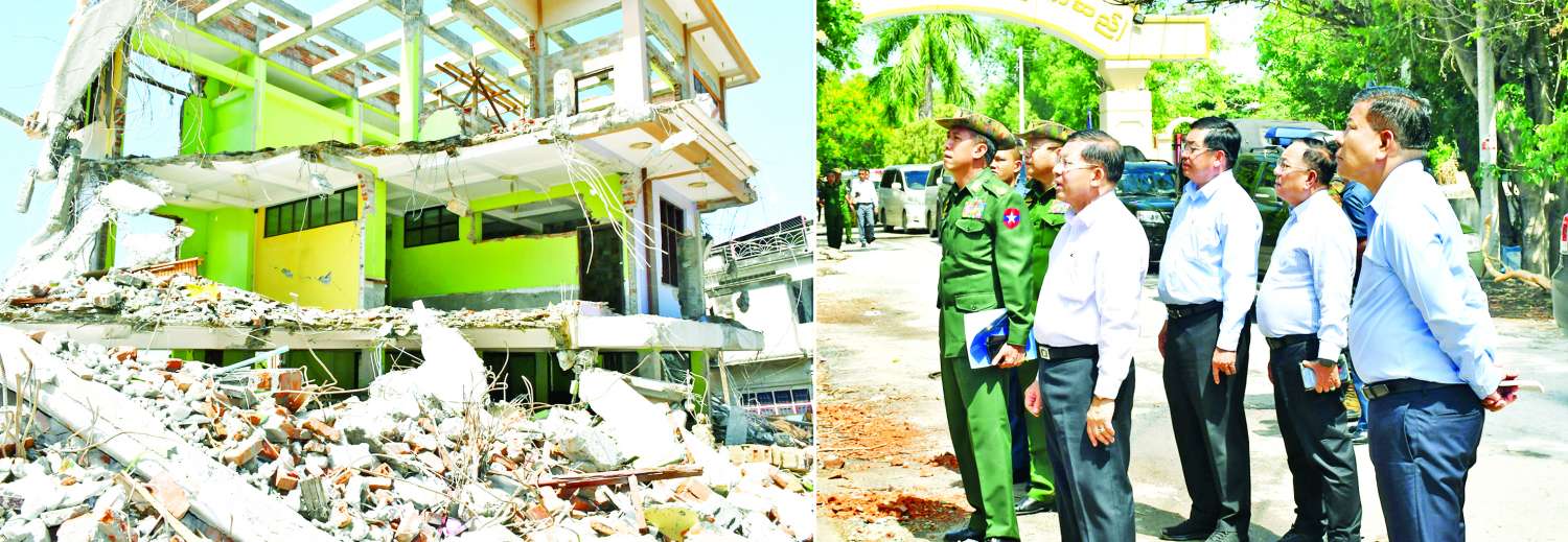 နိုင်ငံတော်စီမံအုပ်ချုပ်ရေးကောင်စီဥက္ကဋ္ဌ နိုင်ငံတော်ဝန်ကြီးချုပ် ဗိုလ်ချုပ်မှူးကြီးမင်းအောင်လှိုင် ကျောက်ဆည်မြို့အတွင်း ငလျင်ဘေးဒဏ်ကြောင့် ထိခိုက်ပျက်စီးခဲ့သည့်အခြေအနေများနှင့် ပြန်လည်ထူထောင်ရေးလုပ်ငန်းများ ဆောင်ရွက်နေမှုများအား သွားရောက်ကြည့်ရှု၊ လိုအပ်သည်များ လမ်းညွှန်မှာကြား