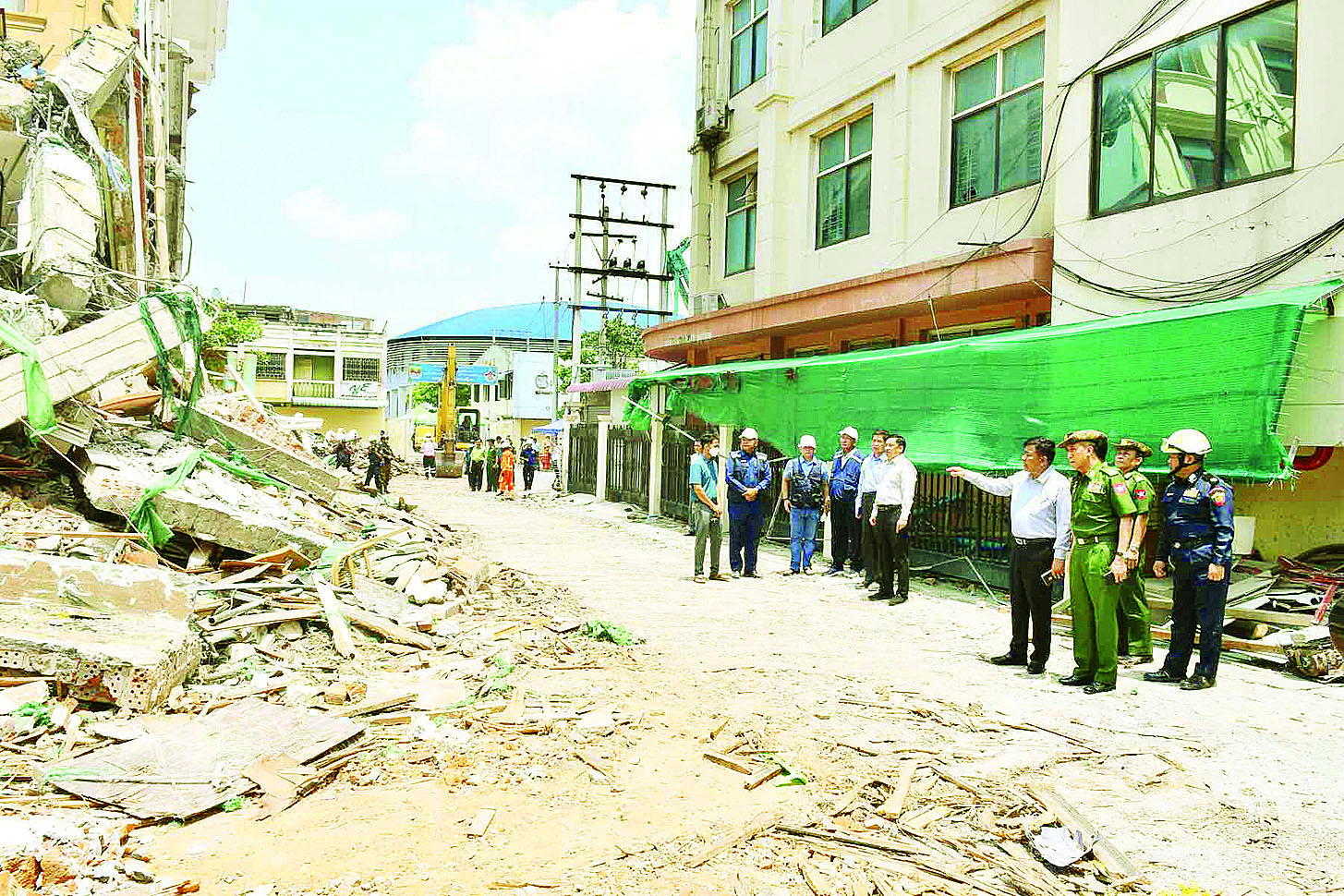 ထို့နောက် ချမ်းအေးသာစံမြို့နယ်ရှိ Golden City Hotel နေရာ၌ အပျက်အစီးများ ဖယ်ရှားရှင်းလင်းနေမှုအားလည်းကောင်း၊ ချမ်းအေးသာစံမြို့နယ်ရှိ အမှတ် (၄) ရေစစ်ကန်၌ ရေပေးဝေရေးလုပ်ငန်းဆောင်ရွက်နေမှုများအားလည်းကောင်း၊ Sky Villa နေရာတွင် အဆောက်အအုံအပျက်အစီးများ ဖယ်ရှားရှင်းလင်းနေမှုများအားလည်းကောင်း သွားရောက်ကြည့်ရှုစစ်ဆေးပြီး လိုအပ်သည်များကို တာဝန်ရှိသူများနှင့် ညှိနှိုင်းပေါင်းစပ်ဆောင်ရွက်ပေးသည်။