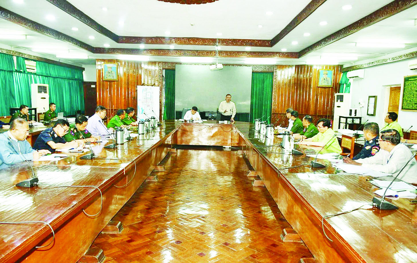 ၎င်းနောက် နိုင်ငံတော်စီမံအုပ်ချုပ်ရေးကောင်စီအဖွဲ့ဝင် ဗိုလ်ချုပ်ကြီး ညိုစောက မိုးရာသီရောက်ရှိတော့မည်ဖြစ်သဖြင့် ရေကြီးရေလျှံမှုများ ဖြစ်ပေါ်လာနိုင်ပြီး ပြည်သူလူထုအခက်အခဲမရှိ အဆင်ပြေကောင်းမွန်စွာ နေထိုင်နိုင်ရေးစနစ်တကျ စီမံဆောင်ရွက်ထားရှိရမည်ဖြစ်ကြောင်း၊ ဆေးဝါးမှအစ တာဝန်ရှိသူများက စီစဉ်ဆောင်ရွက်ပေးထားရမည်ဖြစ်ကြောင်း၊ ပြန်လည်တည်ဆောက်ရေးလုပ်ငန်းများအတွက် ဆောက်လုပ်ရေးပစ္စည်းများ လိုအပ်ချက်ရှိနိုင်မည်ဖြစ်သည့်အတွက် လိုအပ်ချက်များအား အချိန်မီတင်ပြတောင်းခံဆောင်ရွက်သွားရမည်ဖြစ်ကြောင်း၊ ဘိလပ်မြေလိုအပ်ချက်နှင့် ပတ်သက်၍ လိုအပ်သလို စီစဉ်ဆောင်ရွက်ပေးသွားမည်ဖြစ်ကြောင်း ပြောကြားသည်။