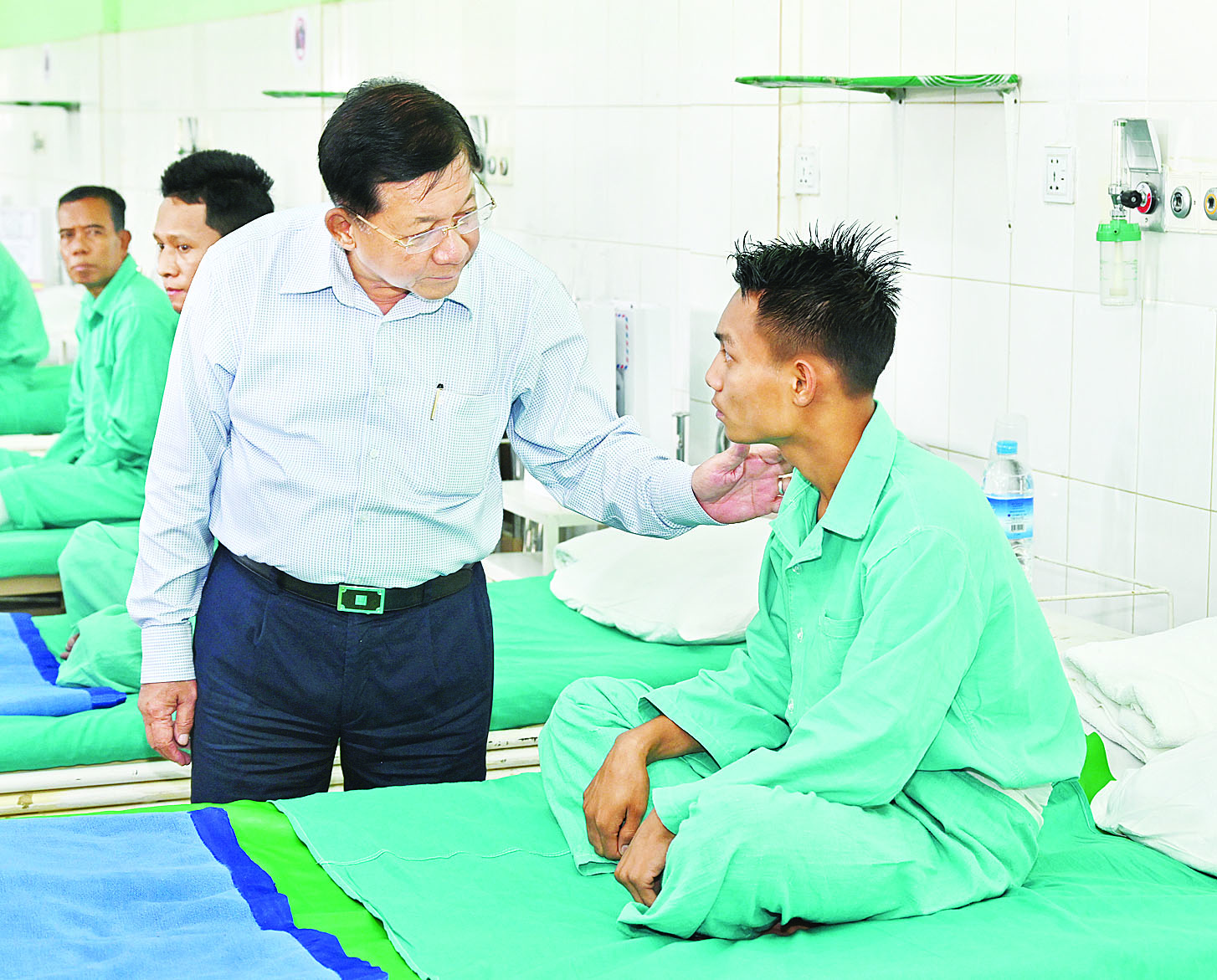 ယင်းနောက် နိုင်ငံတော်စီမံအုပ်ချုပ်ရေးကောင်စီဥက္ကဋ္ဌ နိုင်ငံတော်ဝန်ကြီးချုပ်နှင့် ဇနီး၊ အဖွဲ့ဝင်များသည် ဆေးရုံ၌တက်ရောက်ကုသမှုခံယူလျက်ရှိသည့် နိုင်ငံတော်ကာကွယ်ရေးနှင့် လုံခြုံရေးတာဝန်များထမ်းဆောင်စဉ် ထိခိုက်ဒဏ်ရာရရှိခဲ့သော အရာရှိ၊ စစ်သည်များ၏ ထိခိုက်ဒဏ်ရာရရှိခဲ့မှု အခြေအနေများ၊ ရောဂါကုသပျောက် ကင်းမှုအခြေအနေများကို တစ်ဦးချင်းလိုက်လံတွေ့ဆုံ၍ ရင်းနှီးနွေးထွေးစွာ မေးမြန်းအားပေးစကားပြောကြားကာ အရာရှိ၊ စစ်သည်များ၏ တင်ပြချက်များအပေါ် လိုအပ်သည်များ ဖြည့်ဆည်းဆောင်ရွက်ပေးသည်။