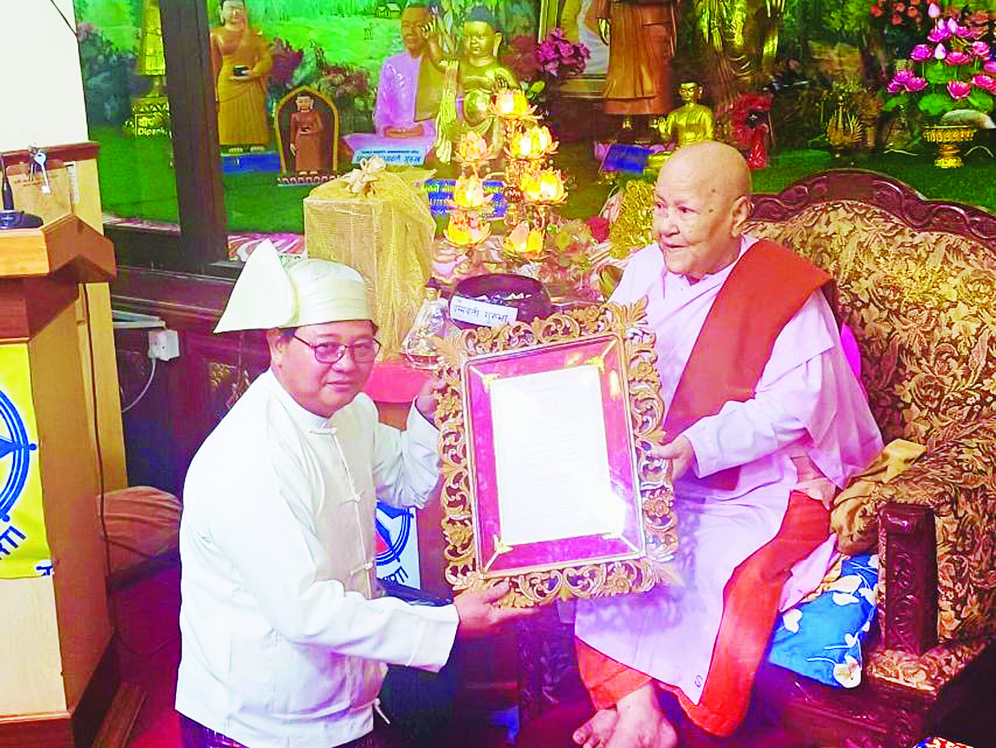 (၇၇) နှစ်မြောက် လွတ်လပ်ရေးနေ့ကို ကြိုဆိုဂုဏ်ပြုသောအားဖြင့် နိုင်ငံတော်စီမံအုပ်ချုပ်ရေးကောင်စီ၏ အမိန့်ကြော်ငြာစာ အမှတ် (၁/၂၀၂၅) (၁၃၈၆ ခုနှစ် ပြာသိုလဆန်း ၆ ရက်) ၂၀၂၅ ခုနှစ် ဇန်နဝါရီ ၄ ရက် ရက်စွဲဖြင့် သာသနာတော်ဆိုင်ရာ ဘွဲ့တံဆိပ်တော်များ ဆက်ကပ်လှူဒါန်းရာတွင် “မဟာသဒ္ဓမ္မဇောတိကဓဇ” ဘွဲ့တံဆိပ်တော် ဆက်ကပ်ချီးမြှင့်ခံခဲ့ရသည့် နီပေါနိုင်ငံကတ္တမန္ဒူး မြို့ရှိ DhamKirti Vihar ကျောင်းတိုက်ဦးစီး သီလရှင်ဆရာကြီး ဒေါ်သုဓမ္မဝတီထံသို့ နိုင်ငံတော်အစိုးရကိုယ်စား နီပေါနိုင်ငံဆိုင်ရာ မြန်မာသံအမတ်ကြီး ဦးမျိုးမြင့်မောင်က ယနေ့တွင်သွားရောက် ဆက်ကပ်လှူဒါန်း သည်။
