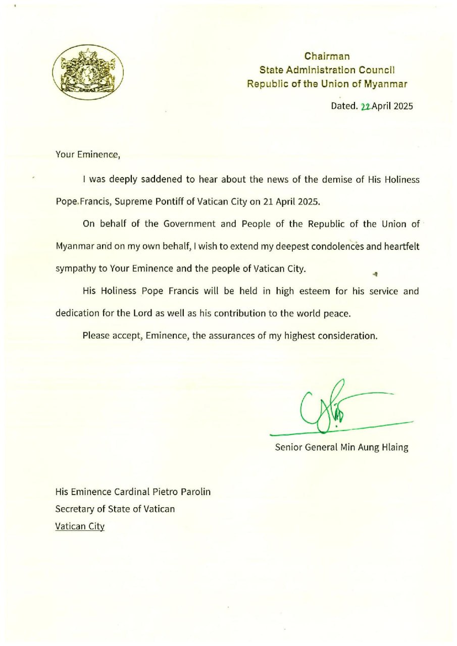 နိုင်ငံတော်စီမံအုပ်ချုပ်ရေးကောင်စီ ဥက္ကဋ္ဌ နိုင်ငံတော်ဝန်ကြီးချုပ် ဗိုလ်ချုပ်မှူးကြီး မင်းအောင်လှိုင်သည် ဗာတီကန်မြို့ပြနိုင်ငံ (Holy See) ၏ ပုပ်ရဟန်းမင်းကြီး ဖရန်စစ် ကွယ်လွန်ခဲ့ခြင်းအတွက် ဗာတီကန်မြို့ပြနိုင်ငံ၊ အစိုးရအဖွဲ့အကြီးအကဲ ဘုန်းတော်ကြီး ပီယဲထရို ပါရိုလင် (His Eminence Cardinal Pietro Parolin)ထံသို့ ယနေ့တွင် ဝမ်းနည်းကြောင်း သဝဏ်လွှာပေးပို့သည်။