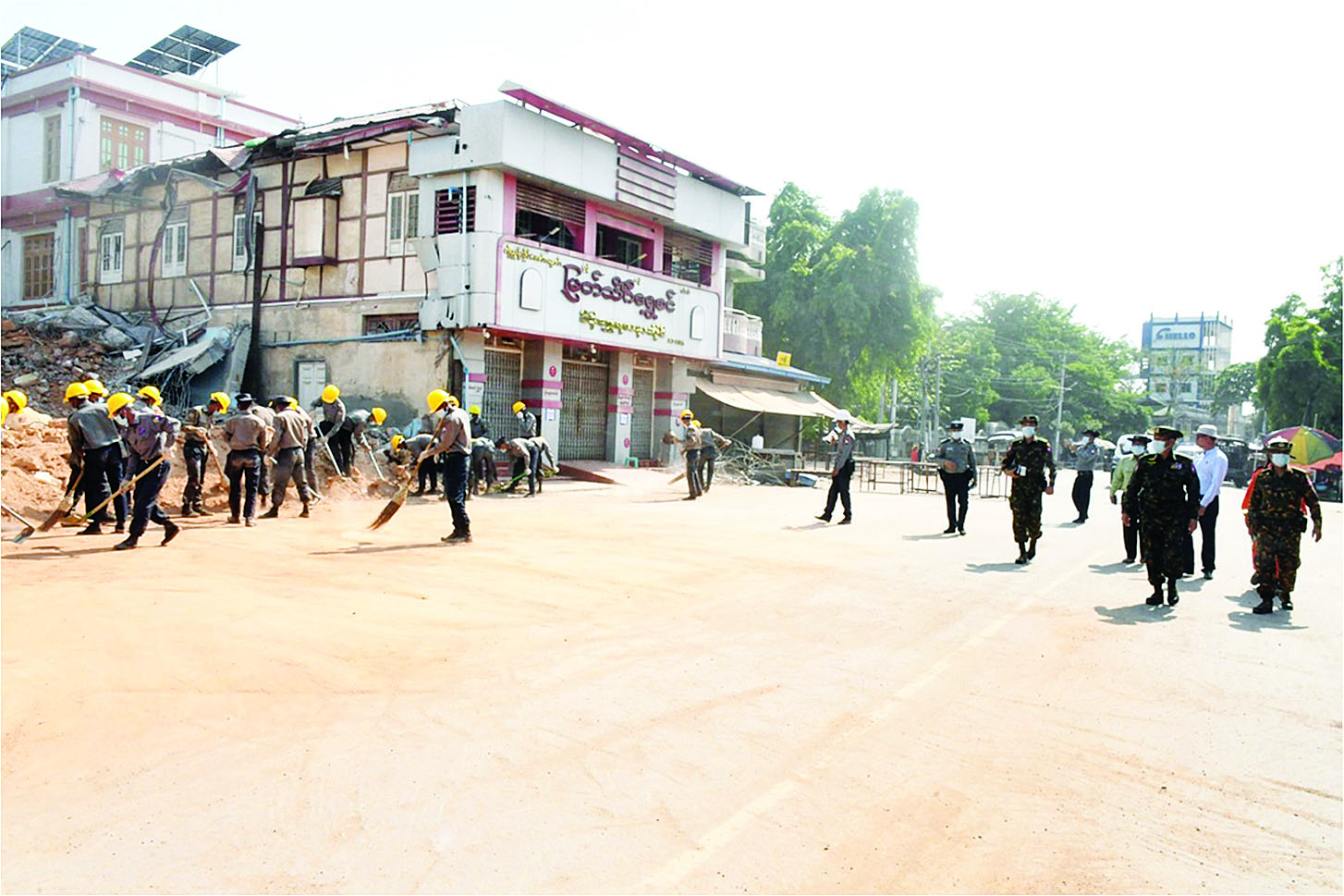 ယင်းနောက် ငလျင်ဒဏ်ကြောင့် ပြိုကျပျက်စီးမှုများဖြစ်ပေါ်ခဲ့သည့် အောင်မြေသာစံမြို့နယ်ရှိ Sky Villa ၊ ချမ်းအေးသာစံမြို့နယ်ရှိ Golden City Hotel ၊ မာကျူရီဟိုတယ်၊ ဘီကျင်ဟိုတယ်၊ တိုင်းသမဝါယမဦးစီးမှူးရုံးနှင့် ချမ်းအေးသာစံမြို့နယ်ရှိ အန္တရာယ်ရှိအဆောက်အဦနေရာများသို့ သွားရောက်၍ အပျက်အစီးများ ရှင်းလင်းဖယ်ရှားနေမှုများအား ကြည့်ရှုပြီး လိုအပ်သည်များကို တာဝန်ရှိသူများနှင့် ပေါင်းစပ်ညှိနှိုင်းဆောင်ရွက်ပေးသည်။