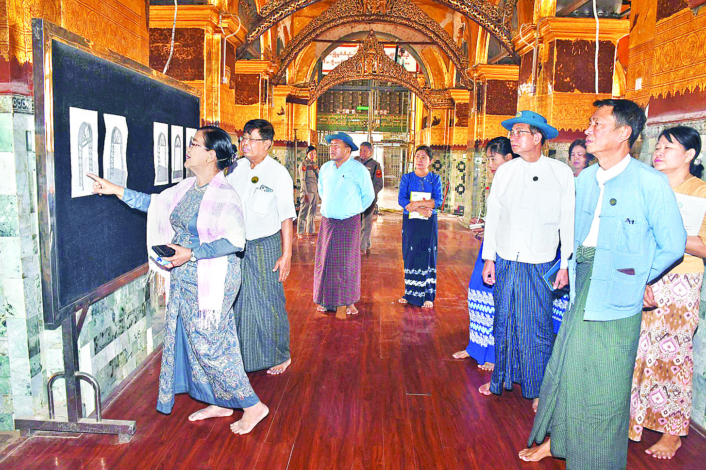 သာသနာရေးနှင့်ယဉ်ကျေးမှုဝန်ကြီးဌာန (ယဉ်ကျေးမှု) ဒုတိယဝန်ကြီးနှင့် ရှေးဟောင်းသုတေသနနှင့်အမျိုးသားပြတိုက်ဦးစီးဌာနမှ တာဝန်ရှိသူများသည် မဟာမုနိဘုရားသို့ ရောက်ရှိရာ မန္တလေးငလျင်ဒဏ်ကြောင့် ထိခိုက်ပျက်စီးခဲ့သည့် တန်ဆောင်း၊ မုခ်ဦးပြုပြင်ထိန်းသိမ်းမှုများကို မဟာမုနိဘုရား ဂေါပကဥက္ကဋ္ဌနှင့်အဖွဲ့က ရှင်းလင်းတင်ပြရာ ဒုတိယဝန်ကြီးမှ မဟာမုနိဘုရားရုပ်ပွားတော်အား ငလျင်ဒဏ်ခံနိုင်ရေးအတွက် အများပြည်သူအား ဆက်လက်ရွှေချခြင်းမပြုစေဘဲ ရုပ်ပွားတော်ရှိ အဆင်တန်ဆာများအား ဝန်ပေါ့အောင် စနစ်တကျဖြုတ်သိမ်း၍ မှတ်တမ်းတင်ထားရှိရန်၊ မလိုအပ်သော အဆင်တန်ဆာများကို ပြခန်းတွင် ပြသထားရှိသွားရန်၊ အနောက်ဘက်မုခ်နှင့် တောင်ဘက်မုခ်ရှိ ထိခိုက်ပျက်စီးခဲ့သော နံရံပန်းချီများကို မူလအစိတ်အပိုင်း ရနိုင်သလောက် ပြန်ဆက်ရန်၊ နဂိုရှိရင်း နံရံဆေးရေးပန်းချီ မှတ်တမ်းဓာတ်ပုံများနှင့် တိုက်ဆိုင်စစ်ဆေးပြီး နံရံပန်းချီအပိုင်းအစများကို မူလပုံစံအတိုင်းရရှိအောင် ပြန်လည်ဆောင်ရွက်သွားရန်၊ နံရံပန်းချီထိန်းသိမ်းရေး ဆောင်ရွက်ရာတွင် လုပ်ငန်းစဉ်အဆင့်အလိုက်၊ အသုံးပြုမည့် ဆေးအမျိုးအစား၊ ဦးစားပေးဆောင်ရွက်မည့်နေရာ အစရှိသည်တို့ပါဝင်သော စီမံချက်ရေးဆွဲဆောင်ရွက်သွားရန် မှာကြားသည်။