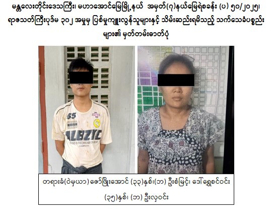 မန္တလေးတိုင်းဒေသကြီး၊ မဟာအောင်မြေမြို့နယ်၌ ဧပြီလ ၂၇ ရက်နေ့က ဖြစ်ပွားခဲ့သည့် ခင်ပွန်းဖြစ်သူအား ဇနီးဖြစ်သူမှ ၎င်းနှင့်လူမှုရေးဖောက်ပြန်နေသည့် အမျိုးသားနှင့် ပူးပေါင်း၍ လုပ်ကြံသတ်ဖြတ်ခဲ့မှုအား ဖော်ထုတ်ဖမ်းဆီးနိုင်ခဲ့ကြောင်း သိရသည်။