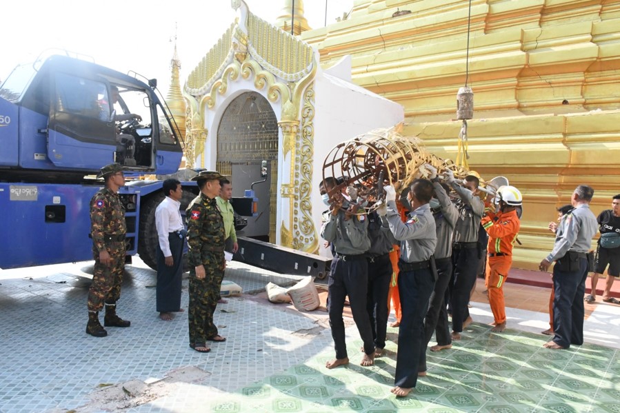 ထို့အတူ ကာကွယ်ရေးဦးစီးချုပ်ရုံး(ကြည်း)မှ ဒုတိယဗိုလ်ချုပ်ကြီး စိုးတင့်နိုင်သည် တာဝန်ရှိသူများနှင့်အတူ မန္တလေးမြို့၊ အောင်မြေသာစံမြို့နယ်ရှိ ဆင်တဲတိုက်သစ်ကျောင်းတိုက်၊ အမရပူရမြို့နယ်ရှိ ပုထိုးတော်ကြီး ဆုတောင်းပြည့်မြတ်စွာဘုရား၊ ဆေးအိုးဘိုကျေးရွာရှိ ဓမ္မမဏ္ဍိုင်ကျောင်း၊ ဇဗူထိပ်ပန်ဘုရား များသို့သွားရောက်၍ ငလျင်ဒဏ်ကြောင့် ပြိုကျပျက်စီးခဲ့သည့် အပျက်အစီးများအား တပ်မတော်သားများ၊ မြန်မာနိုင်ငံရဲတပ်ဖွဲ့ဝင်များ၊ မီးသတ်တပ်ဖွဲ့ဝင်များ၊ ဌာနဆိုင်ရာဝန်ထမ်းများ၊ လူမှုကူညီရေး အသင်းအဖွဲ့များပူးပေါင်း၍ ကူညီကယ်ဆယ်ရေးလုပ်ငန်းများ အရှိန်အဟုန်မြှင့်ဆောင်ရွက်နေသည်များကို လည်းကောင်း၊ အပျက်အစီးများ ဖယ်ရှားရှင်းလင်းဆောင်ရွက်ပြီးစီးမှုအခြေအနေများကိုလည်းကောင်း၊ ဘုရားစေတီပုထိုးများတွင် ရှေးမူမပျက်ပြန်လည်ပြုပြင်တည်ဆောက်ရေးလုပ်ငန်းများ ဆောင်ရွက်နေမှု အခြေအနေများကိုလည်းကောင်း ကြည့်ရှုအားပေး၍ ဆရာတော်ကြီးများအား အလှူငွေများ ပေးအပ်လှူဒါန်းကာ ငလျင်ဒဏ်ကြောင့် ထိခိုက်ပျက်စီးခဲ့သော ဘုရားစေတီပုထိုးများမှ အပျက်အစီးများရှင်းလင်းစဉ် ပြန်လည်သိမ်းဆည်းတွေ့ရှိရသော ဌာပနာပစ္စည်းများအား စနစ်တကျထားရှိထိန်းသိမ်းရန်နှင့် ပြန်လည်တည်ဆောက်ရေးလုပ်ငန်းများ အမြန်ဆုံးဆောင်ရွက်နိုင်ရေးတို့အတွက် တာဝန်ရှိသူများအားမှာကြား၍ လိုအပ်သည်များ ပေါင်းစပ်ညှိနှိုင်း ဆောင်ရွက်ပေးခဲ့သည်။