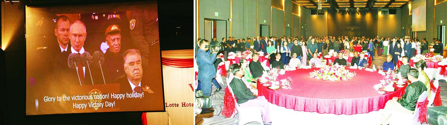 ရုရှားဖက်ဒရေးရှင်းနိုင်ငံ၏ (၁၉၄၁ - ၁၉၄၅) မဟာမျိုးချစ်စစ်ပွဲကြီးအောင်ပွဲ နှစ် (၈၀) ပြည့်အထိမ်းအမှတ် ညစာစားပွဲအခမ်းအနားကို ယနေ့ညပိုင်းတွင် ရန်ကုန်မြို့ရှိ Lotte Hotel ၌ ကျင်းပရာ နိုင်ငံတော်စီမံအုပ်ချုပ်ရေးကောင်စီ ဒုတိယဥက္ကဋ္ဌ ဒုတိယဝန်ကြီးချုပ် ဒုတိယဗိုလ်ချုပ်မှူးကြီး စိုးဝင်းနှင့် ဇနီး ဒေါ်သန်းသန်းနွယ် တက်ရောက်ချီးမြှင့်သည်။