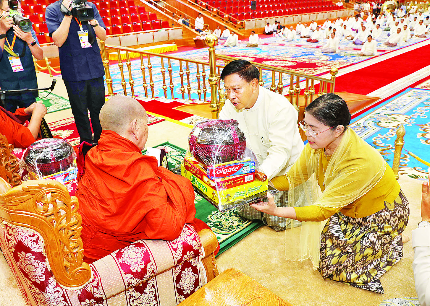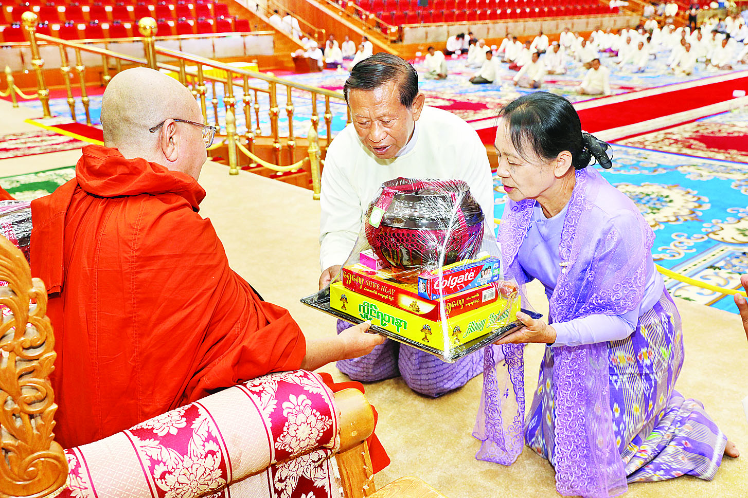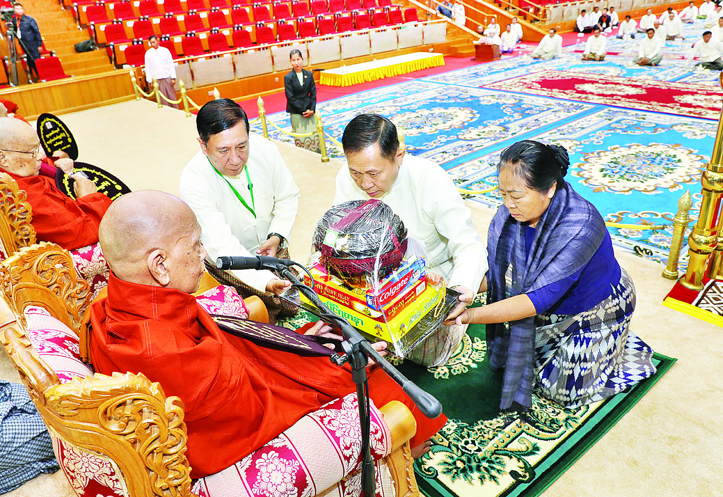 အခမ်းအနားသို့ အထူးပင့်ဖိတ်ထားသည့် နိုင်ငံတော် သံဃမဟာနာယကအဖွဲ့ဥက္ကဋ္ဌ ရန်ကုန်တိုင်းဒေသကြီး သန်လျင်မြို့မင်းကျောင်းပထမပြန် စာသင်တိုက်ပဓာနနာယက၊ အဂ္ဂမဟာပဏ္ဍိတ အဂ္ဂမဟာသဒ္ဓမ္မဇောတိကဓဇ ဒေါက်တာဘဒ္ဒန္တစန္ဒိမာဘိဝံသနှင့် နိုင်ငံတော်သံဃမဟာနာယကအဖွဲ့ အကျိုးတော်ဆောင်၊ မန္တလေးတိုင်းဒေသကြီးမဟာ အောင်မြေမြို့နယ် မစိုးရိမ်တိုက်သစ် မဟာနာယက ဓမ္မသမိဒ္ဓိ ကျောင်းဆရာတော် အဂ္ဂမဟာပဏ္ဍိတ အဂ္ဂမဟာ သဒ္ဓမ္မဇောတိကဓဇ မဟာဓမ္မ ကထိကဗဟုဇနဟိတဓရ ဘဒ္ဒန္တဝါသေဋ္ဌာဘိဝံသတို့ အမှူးပြုသည့် ဆရာတော်ကြီးများ ကြွရောက်ချီးမြှင့်တော်မူကြပြီး နိုင်ငံတော် စီမံအုပ်ချုပ်ရေးကောင်စီ ဒုတိယဥက္ကဋ္ဌ ဒုတိယဝန်ကြီးချုပ်နှင့် ဇနီးတို့နှင့်အတူ ကောင်စီအတွင်းရေးမှူးနှင့် ဇနီး၊ ကောင်စီဝင်များနှင့် ဇနီးများ၊ ပြည်ထောင်စုအဆင့်ပုဂ္ဂိုလ်များ၊ ပြည်ထောင်စုဝန်ကြီးများနှင့် ဇနီးများ၊ နေပြည်တော်ကောင်စီဥက္ကဋ္ဌ၊ ကာကွယ်ရေးဦးစီးချုပ်ရုံးမှ အဆင့်မြင့်တပ်မတော် အရာရှိကြီးများနှင့်ဇနီးများ၊ နေပြည်တော် တိုင်းစစ်ဌာနချုပ်တိုင်းမှူးနှင့် တာဝန်ရှိသူများ တက်ရောက်ကြည်ညိုကြသည်။