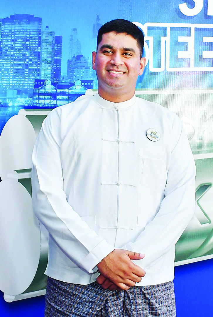 ကျွန်တော်တို့ STEEL KING ကုမ္ပဏီအနေနဲ့ ဒီပြပွဲမှာ သံနဲ့ ပတ်သက်ပြီးတော့ သံချောင်းတွေ၊ Hollow တွေ၊ H Beam တွေ၊ အဆောက်အအုံနဲ့ ပတ်သက်တဲ့ ပစ္စည်းတွေ၊ ငလျင်ဒဏ်ခံနိုင်တဲ့ မြေထိန်းတုံး Sheet pile ပစ္စည်းတွေနဲ့ သံတွေကို အဆင့်မြှင့်ထုတ်လုပ်ရေးစက်နဲ့တကွ ကျွန်တော်တို့အနေနဲ့ ပြသရောင်းချပေးနေပါတယ်။