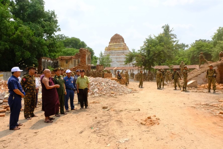 ထို့အတူ ကာကွယ်ရေးဦးစီးချုပ်ရုံး(ကြည်း)မှ ဒုတိယဗိုလ်ချုပ်ကြီး စိုးတင့်နိုင်နှင့် တာဝန်ရှိသူများသည် မန္တလေးမြို့၊ ပြည်ကြီးတံခွန်မြို့နယ်ရှိ သာသနိကအဆောက်အဦနေရာများ၌ ငလျင်ဒဏ်ကြောင့် ပြိုကျပျက်စီးခဲ့သည့် အပျက်အစီးများအား စက်ယန္တရားကြီးများဖြင့် အပျက်အစီးများ ဖယ်ရှားရှင်းလင်းနေမှုများ၊ ဘုရားစေတီပုထိုးများတွင် ရှေးမူမပျက် ပြန်လည်ပြုပြင်တည်ဆောက်ရေးလုပ်ငန်းများ ဆောင်ရွက်နေမှုအခြေအနေများနှင့် အပျက်အစီးများ ဖယ်ရှားရှင်းလင်းစဉ် တွေ့ရှိရသော ဋ္ဌာပနာပစ္စည်းများ စနစ်တကျအပ်နှံထားရှိမှုများကို သွားရောက်ကြည့်ရှုစစ်ဆေးပြီး အလှူငွေများ ပေးအပ်လှူဒါန်းကာ ပြန်လည်တည်ဆောက်ရေးလုပ်ငန်းများ အမြန်ဆုံးဆောင်ရွက်နိုင်ရေးတို့အတွက် တာဝန်ရှိသူများအား မှာကြားသည်။