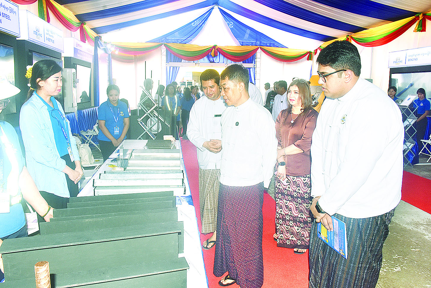 ဦးစွာ ပြည်ထောင်စုဝန်ကြီးသည် အရောင်းပြခန်းများ၌ ပြသရောင်းချလျက်ရှိသော ဘိလပ်မြေရောင်းဝယ်မှုအခြေအနေများ၊ သံ၊ သံမဏိပစ္စည်း ရောင်းချမှုအခြေအနေ၊ ဆောက်လုပ်ရေးလုပ်ငန်းသုံးပစ္စည်းများနှင့် သုတ်ဆေးများ ရောင်းချနေမှုအခြေအနေများ၊ အိမ်တွင်းအလှဆင်ပစ္စည်းရောင်းချရမှု အခြေအနေများ၊ လုပ်ငန်းသုံးမီးစက်ရောင်းချနေမှုအခြေအနေများ၊ အဆောက်အအုံဆောက်လုပ်ရာတွင် အသုံးပြုသည့် သံလုံးအရစ်ဖော်စက်နှင့် သံလုံးဖြတ်စက်၊ သံချည်သံကွေးစက်၊ စတားကွင်းရိုက်စက်ဖြင့် ပုံဖော်ခြင်းလုပ်ငန်း လက်တွေ့သရုပ်ပြလုပ်ဆောင်နေမှုအခြေအနေများကို ကြည့်ရှုပြီး ရောင်းချပွဲသို့ လာရောက်ကြသည့် ရဟန်းရှင်လူပြည်သူများကို ဈေးနှုန်းသက်သာစွာ ရောင်းချပေးရေး တာဝန်ရှိသူများအား မှာကြားသည်။