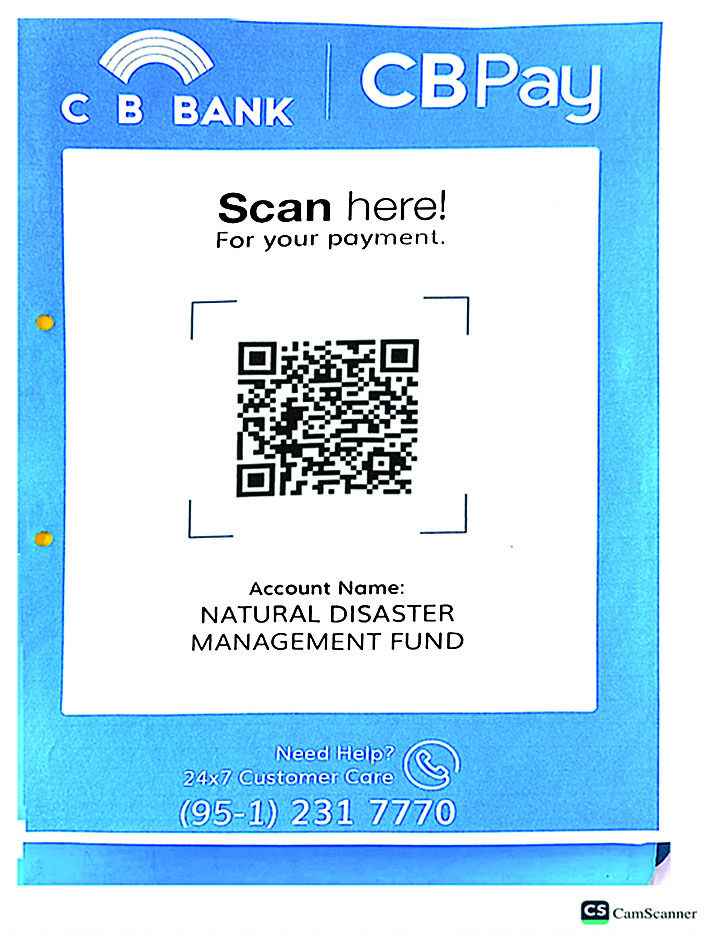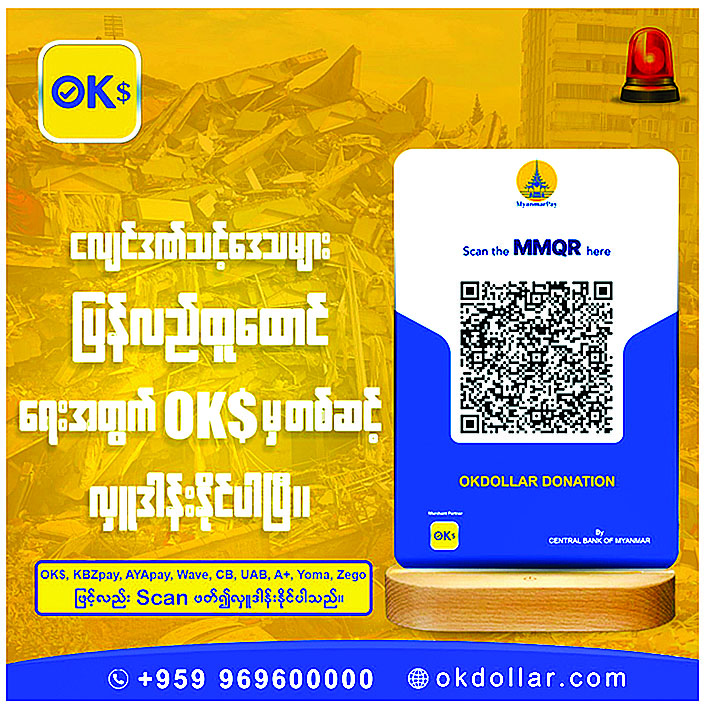 ၂။ အလှူငွေများကို မိုဘိုင်းငွေပေးချေမှုစနစ်ဖြင့် လှူဒါန်းလိုပါက KBZ Pay, CB pay, AYA Pay, OK$, Wave Money တို့၏ QR များကို Scan ဖတ်၍လည်းကောင်း၊ KBZ Pay QR code နံပါတ် 70157401001 သို့လည်းကောင်း၊ Wave Money ဖြင့် လှူဒါန်းလိုပါက ဖုန်းနံပါတ်(၀၉-၂၅၅၀၀၁၅၄၂ နှင့် ၀၉-၂၅၅၀၀၁၅၄၃) တို့သို့ တိုက်ရိုက်ပေးသွင်း၍လည်းကောင်း လှူဒါန်းခြင်းများ ဆောင်ရွက်နိုင်ပါသည်။ ထို့ပြင် ဗဟိုဘဏ်မှခွင့်ပြုထားသော မိမိနှစ်သက်ရာမည်သည့် Digital Wallet သို့မဟုတ် ဘဏ် Mobile Application မှမဆို KBZ Pay MMQR နှင့် CB Pay MMQR၊ OK$ MMQR များကို Scan ဖတ်၍ လှူဒါန်းနိုင်ပါသည်။